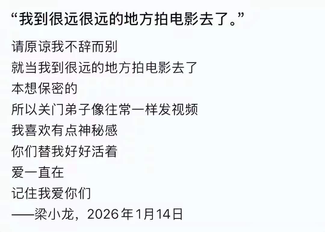 如今舆论真的会压垮一些人,原本工作室已经体面的用梁小龙的口吻与大家告别,说自己只是去了很远的地方拍戏,希望大家不要挂念,要好好的生活。