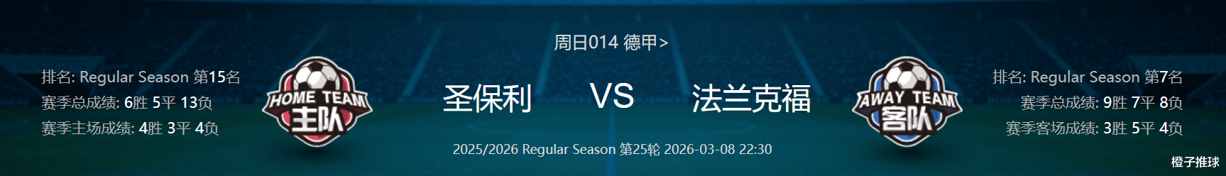 看法:圣保利主场表现稳定,近期抢分势头明显,阵容虽有伤病但战术执行力强,保级压力驱动战意,法兰克福整体实力更强,进攻端效率高,但防守端漏洞较多,伤病影响较大,客场表现不佳,历史交锋方面,近2次法兰克福1胜1平保持不败,心理层面占优。综合考虑阵容、状态、历史交锋和数据走势,本场比赛个人更倾向于法兰克福客场不败。
