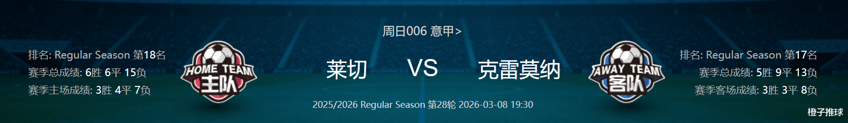 莱切近期状态堪忧,近10轮联赛仅收获2胜1平7负的战绩,整体表现难以令人满意,上轮联赛客场1-3败于科莫后,球队遭遇联赛两连败,士气受到一定打击。伤停方面,球队轮换前锋卡马尔达肩关节受伤,预计3月中旬才能复出;中场核心贝里沙膝关节损伤,将继续缺阵,本赛季他联赛出场13次,其中12次首发,打入2球并送出3次助攻,其缺席对球队前场进攻影响巨大;主力中卫加斯帕同样膝关节受伤,也将继续缺席。此外球队本赛季首次客场对阵克雷莫纳时以0-2告负,在心理层面不占优势。
