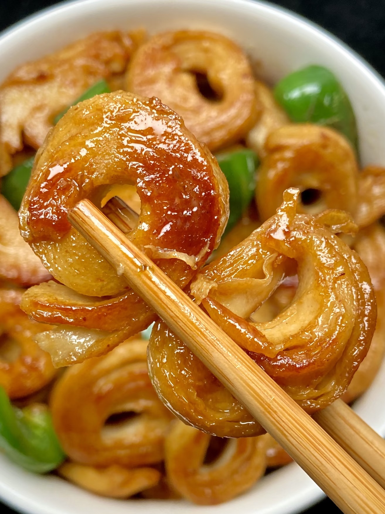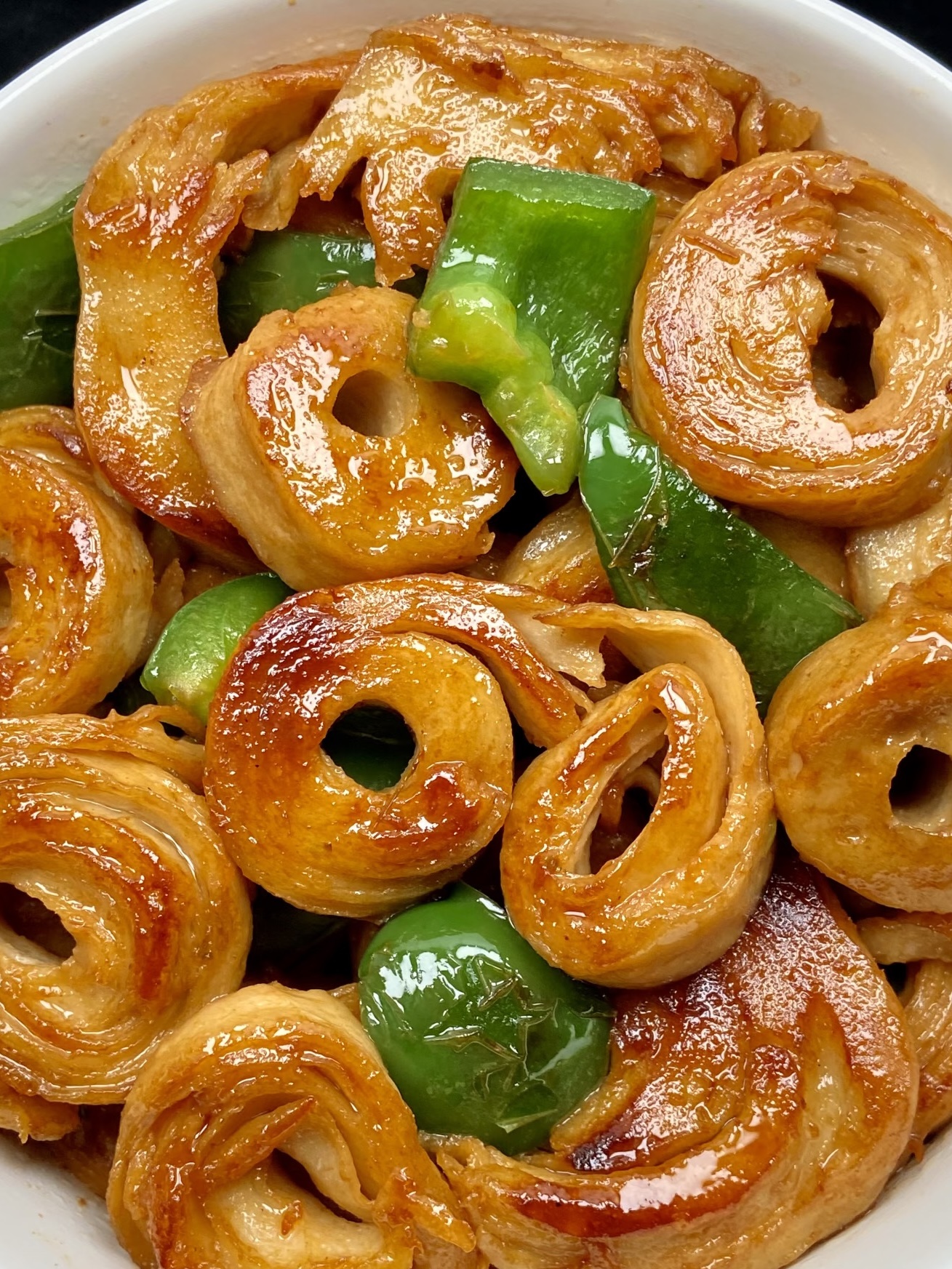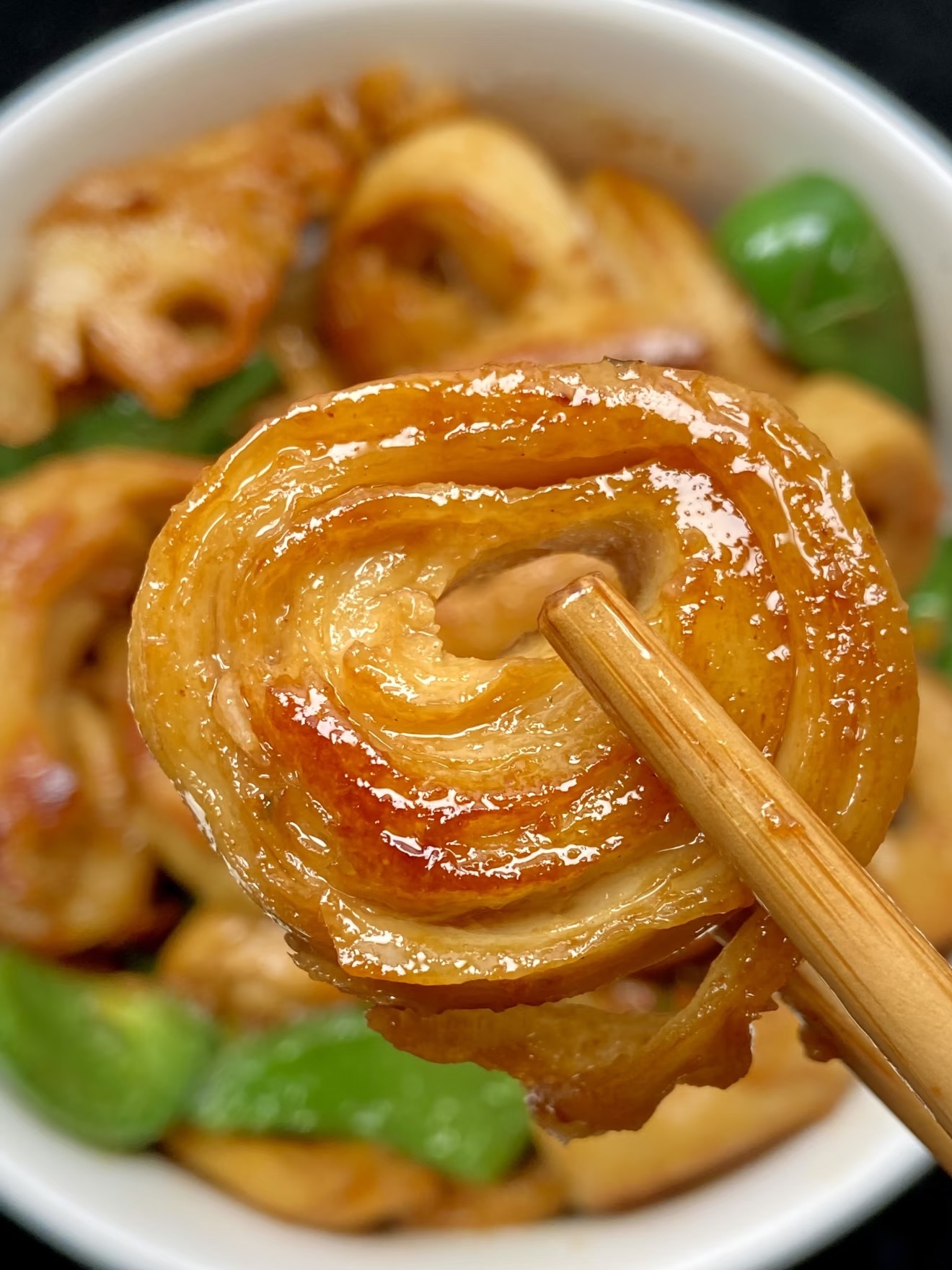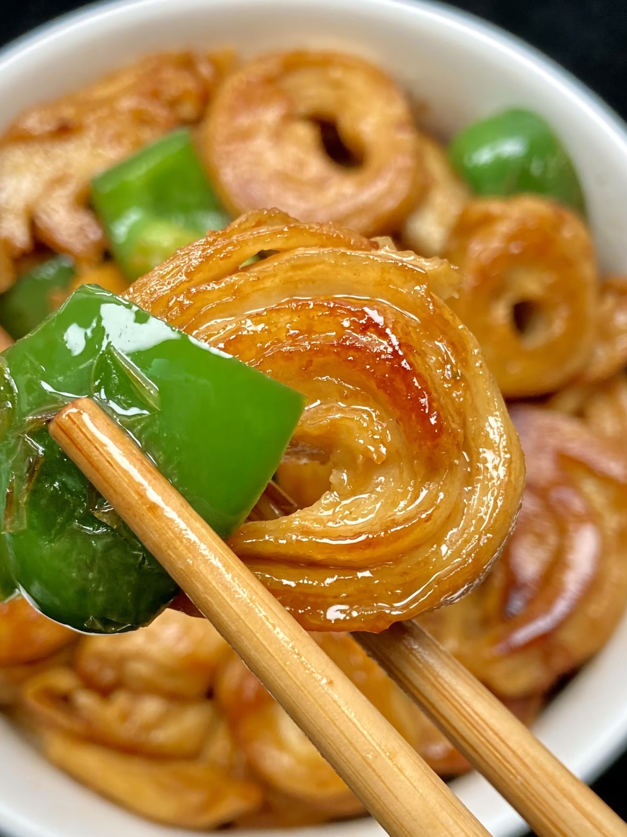 刚出锅的青椒炒面筋,热气带着孜然和蒜香直往鼻子里钻,青椒块油亮翠绿,咬一口“咔嚓”带脆,却汁水四溢;面筋块外焦内弹,嚼起来“咯吱咯吱”,像在嘴里跳橡皮筋,酱汁裹得严严实实,咸、鲜、微辣、回甜依次登场,最后留下淡淡醋香,勾得你立刻想配口冰可乐。最绝的是锅底那几粒孜然,不小心嚼到,烧烤味瞬间爆炸,仿佛置身夜市小摊,老板问你要不要加辣。