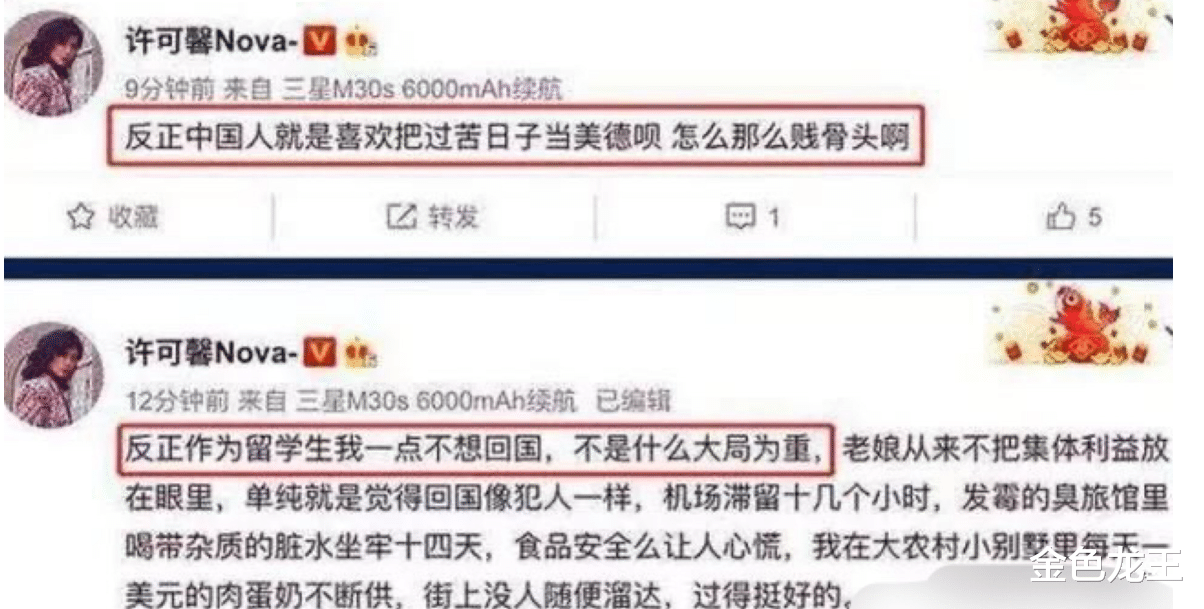 就在众人都在为这些逆行者所感动的时候,身在国外的许可馨却说如果自己的朋友们在武汉,她一定劝说他们赶紧逃出去,不用管其他人的死活。这句话虽然说得很自私,很不合时宜,但是这也是她自己一种狭隘思想的体现,并没有引起太多人的关注。但就是这第一次的得意,让她开始变得一发不可收拾,随后她的言论不断刷新人们的三观,甚至直接开始用言语来辱骂和抹黑自己的祖国。那次之后,她下一条言论直接开始抨击我国的传统美德,不仅将这些留下传来的美德当作是糟粕,甚至直接表示中国人就是因为贱才会这么能吃苦。不仅如此,她还将自己自私自利的一面当作是优点,并由此借机讽刺那些有集体荣誉感的人,说他们是脑子坏了才会以集体为主。这些言论瞬间就引爆了国人的愤怒,一时间她的各种社交账号下面全是骂她的话,而她却丝毫不在意,并且直接和国人对骂了起来。不仅如此,许可馨在对骂的过程中也处处都在歪曲事实,对我们的祖国和同胞可谓是各种污言秽语也是层出不穷。