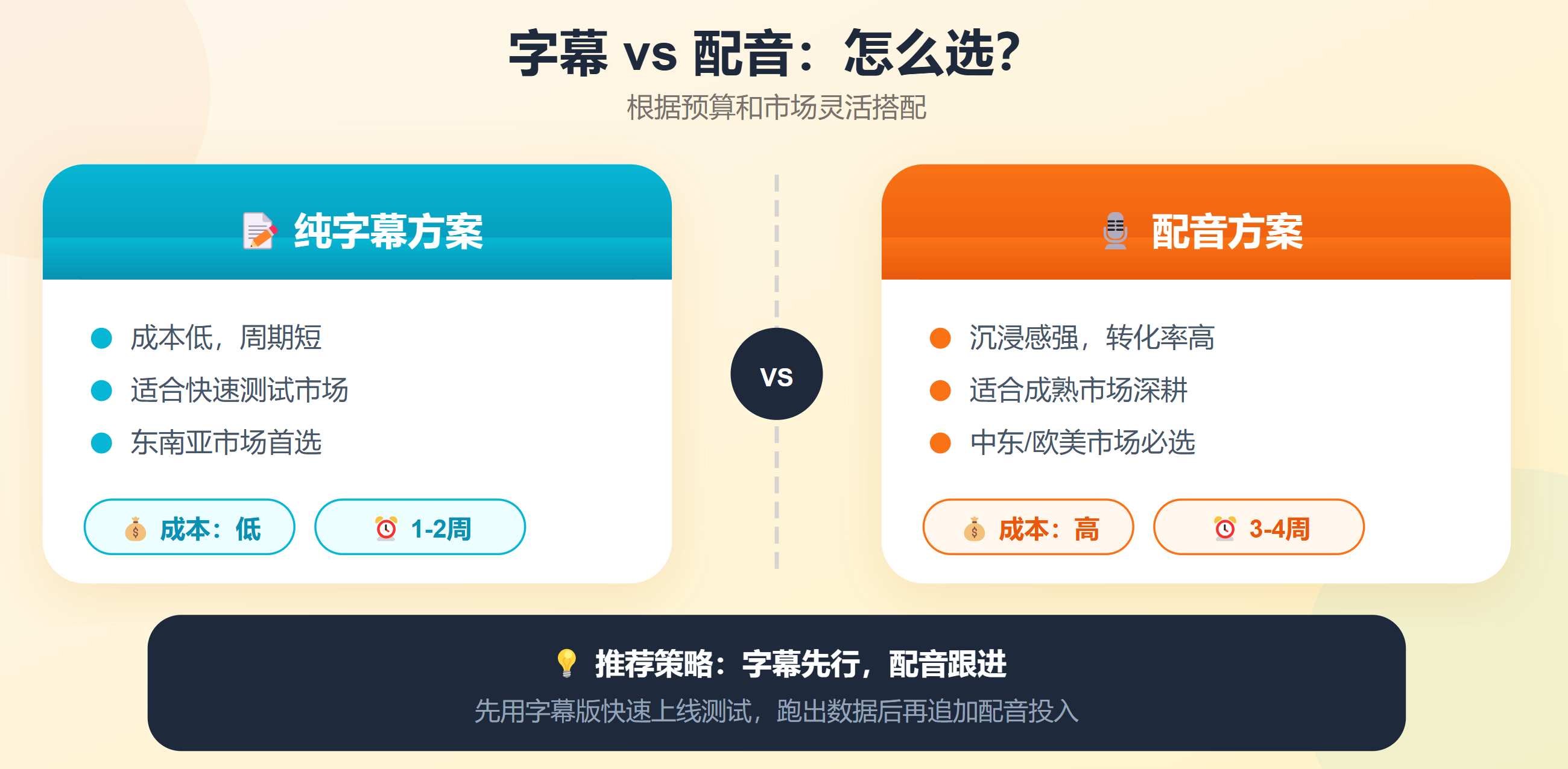 目前行业里比较主流的做法是"字幕先行、配音跟进"——先用字幕版快速上线测试数据,跑出来的剧再追加配音投入。既控制前期风险,又不错过爆款的放大机会。