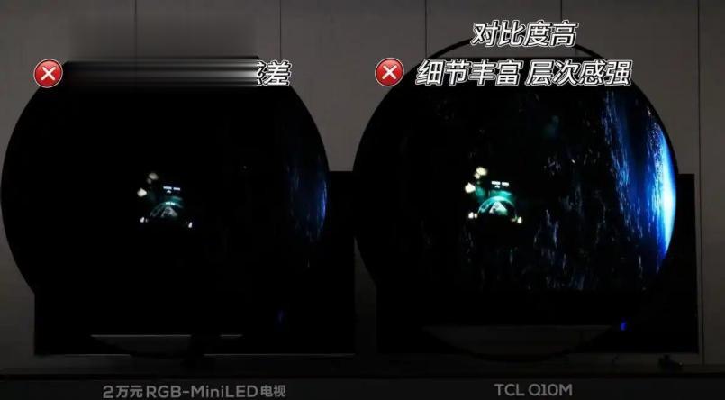 对比度上:同灯数、同成本下,SQD的有效物理分区数可达RGB-Mini LED的3~6倍,尤其是配合TCL独家的万象分区,不再是简单去堆数量赚流量,而是从发光芯片、微透镜、微距OD、算法到原生的超高对比度屏幕协同,是一套系统级控光方案,让每个分区都真正“管得住光”,完全可以实现“一区顶多区”的高效控光,让暗场更纯、亮部更清晰,层次细节都能展现出来。