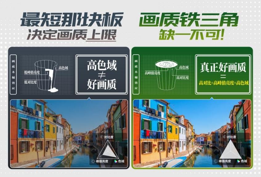真正的好画质=高对比度+高峰值色域+高色域,综合画质指标全面提升,才是真正好画质的终极答案,只有高色域一条腿,根本站不稳脚跟。