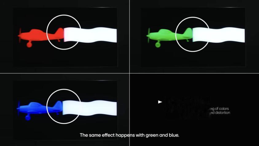 LG还揭开了RGB的另一个短板就是串色。RGB背光是控色分区,如果分区不够细、控光算法跟不上,对比度不足,画面的边缘就容易出现颜色溢出,明显看到测试时飞机后面拖着的白色横幅被染色了,木桶原理大家都懂,这种严重短板,就预示着画质的综合体验不会高。
