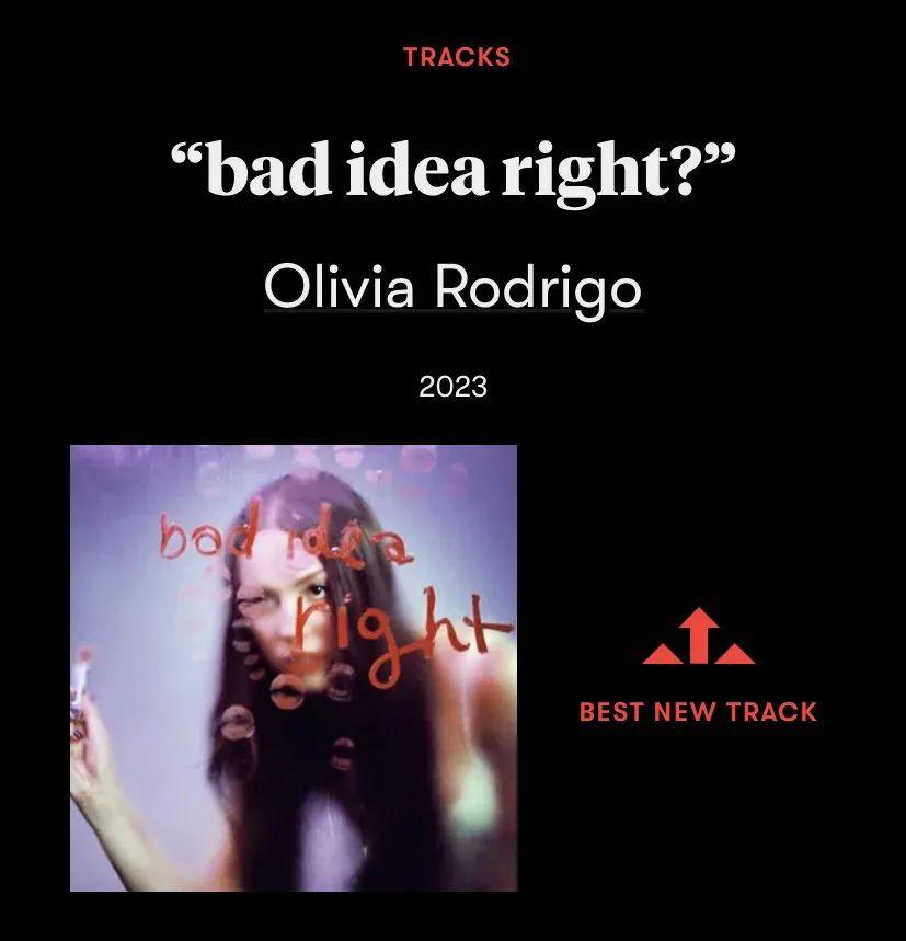曾荣获格莱美多项大奖的前迪士尼女星、Z世代菲律宾裔欧亚混血儿唱作人气女声“娅娅”Olivia Rodrigo(奥利维亚·罗德里戈)近日发布了个人新专辑《GUTS》的第二支单曲《bad idea right?》。 单曲《bad idea right?》又一次获得了 Pitchfork 的 BEST NEW TRACK。