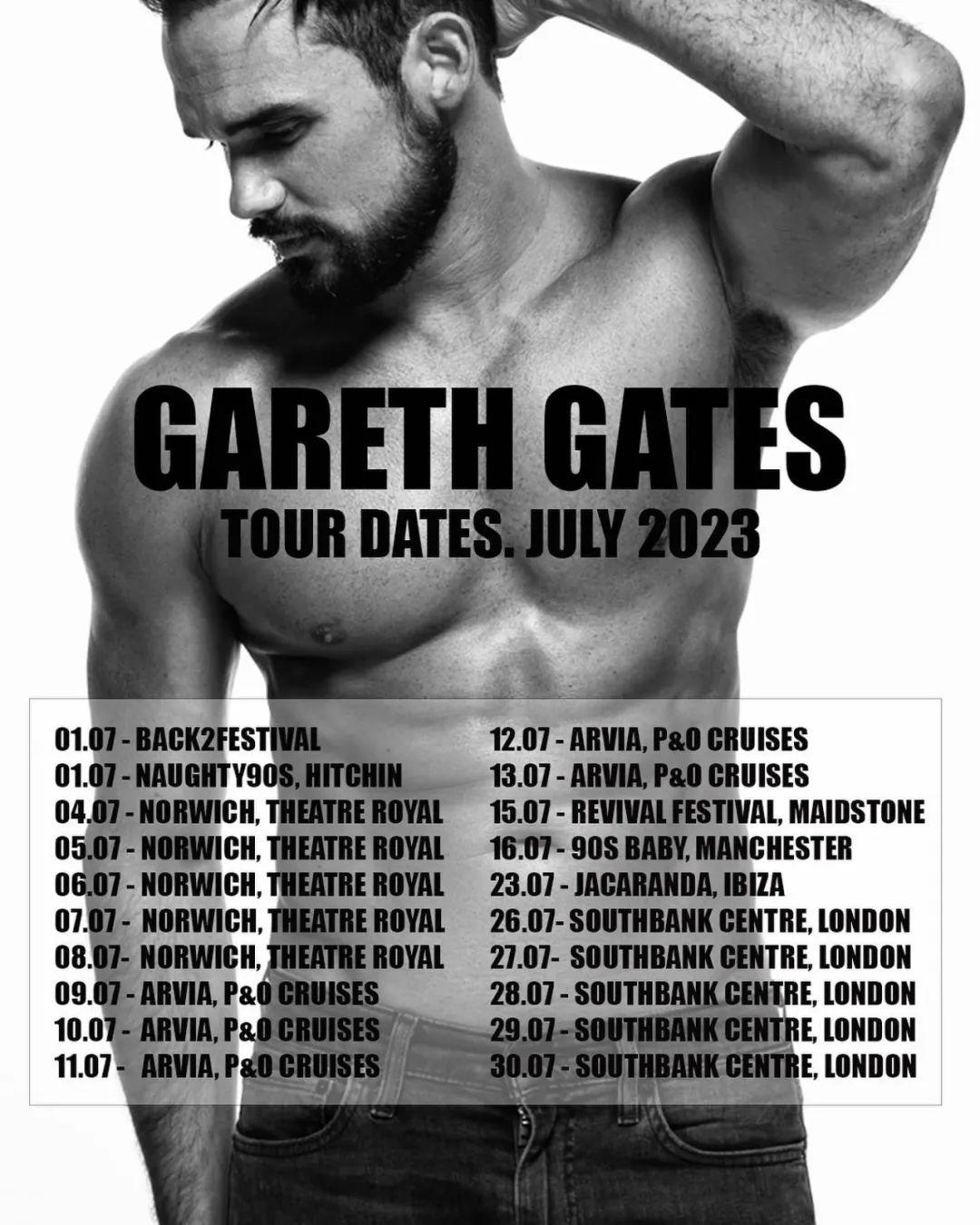 最近,Gareth Gates(葛瑞·盖斯)成为了英国乐坛的最内卷的人物,从今年四月起,他开始疯狂开演唱会,而且保持着超高的频率。 四月开了22场,五月开了23场,六月开了28场,七月开了20场,而在本月他又计划举办24场演唱会,五个月共举办117场,堪称最努力复出。 Gareth Gates 这次的复出演唱会虽然有些场很小,也很低端,只是当地的 Livehouse。 但他真的很努力,毕竟已经在娱乐圈消失了十多年,这次 Gareth Gates 也放下了身段,只要有人邀请就开工。