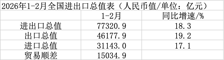海关总署公布2026年1-2月外贸数据。以美元计,2026年1-2月,中国进出口总值10995.4亿美元,同比增长21.0%。其中,出口6565.8亿美元,同比增长21.8%;进口4429.6亿美元,同比增长19.8%;贸易顺差2136.2亿美元。