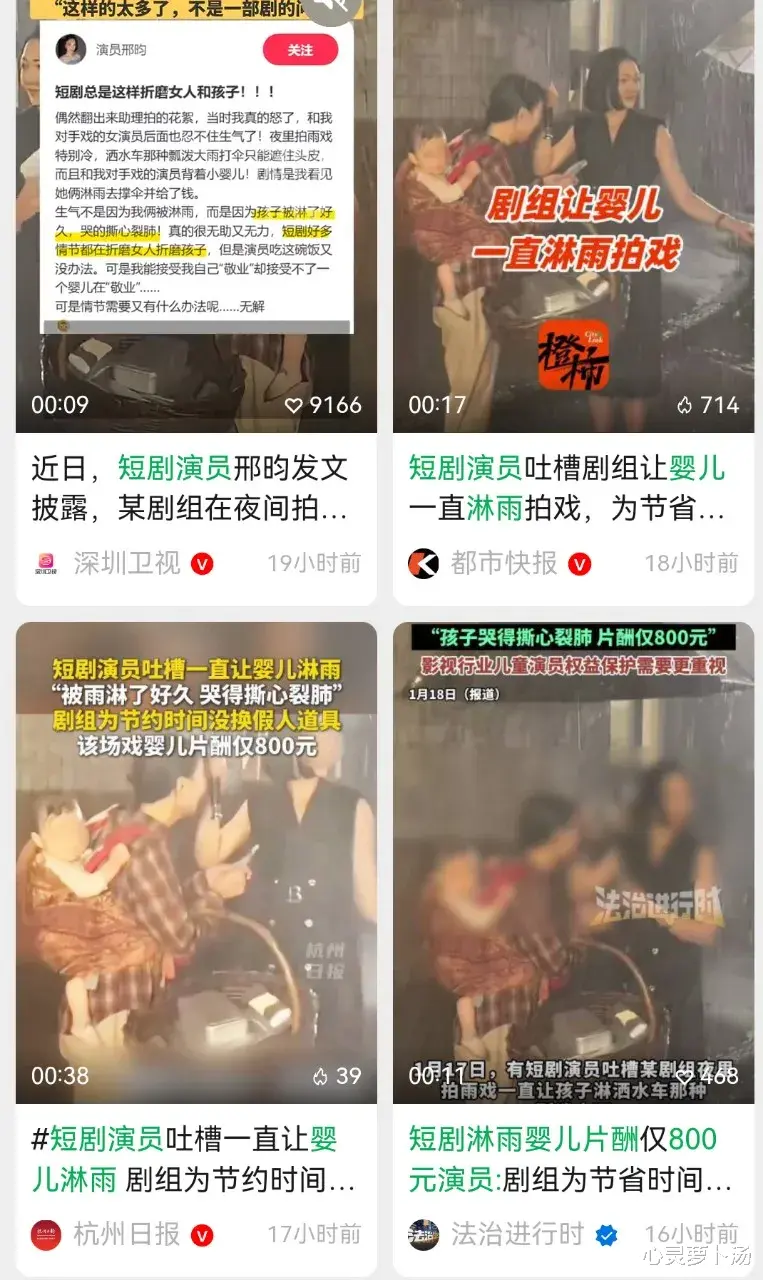 当资本裹挟着流量在短剧赛道上狂奔时,一些稚嫩的身影却在镜头背后承受着不该属于童年的重压。最近,一则爆料像一盆冷水,浇醒了沉浸在短剧造富神话中的人们:某剧组夜拍雨戏,竟让真实的婴儿在寒冬中淋着洒水车的大雨进行近景拍摄。婴儿撕心裂肺的哭声穿透了拍摄现场,也刺痛了公众的心。更令人心酸的是,这场戏的婴儿片酬仅800元,而部分家长因经济压力,无奈接受了这样的安排。这绝非孤例,去年7月,童星西西在淋雨戏后未能及时获得热水和保暖措施,同样引发了广泛争议。这些刺眼的案例,撕开了短剧行业高速发展下,儿童演员权益保障严重缺失的冰山一角。