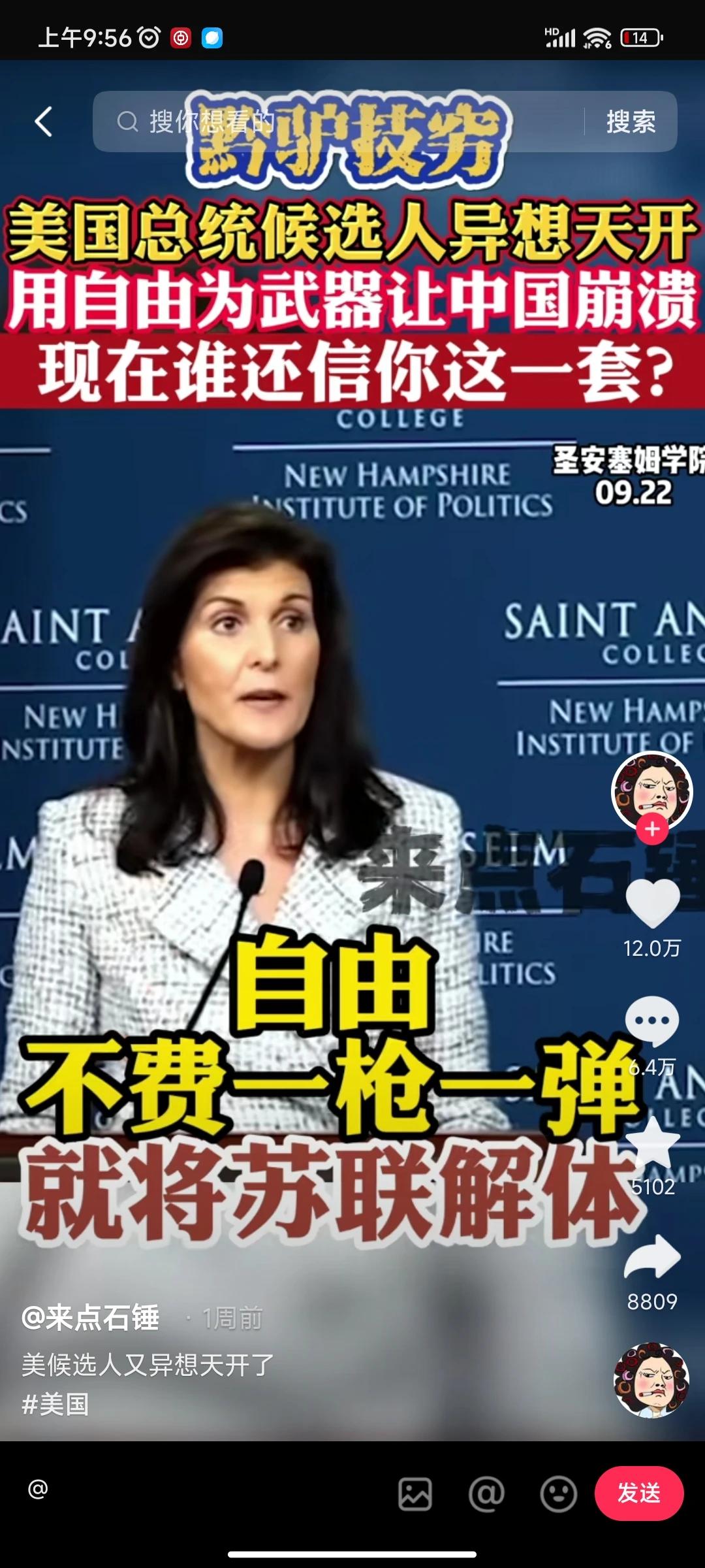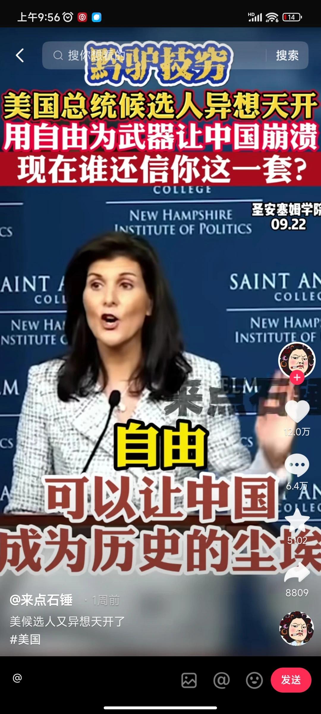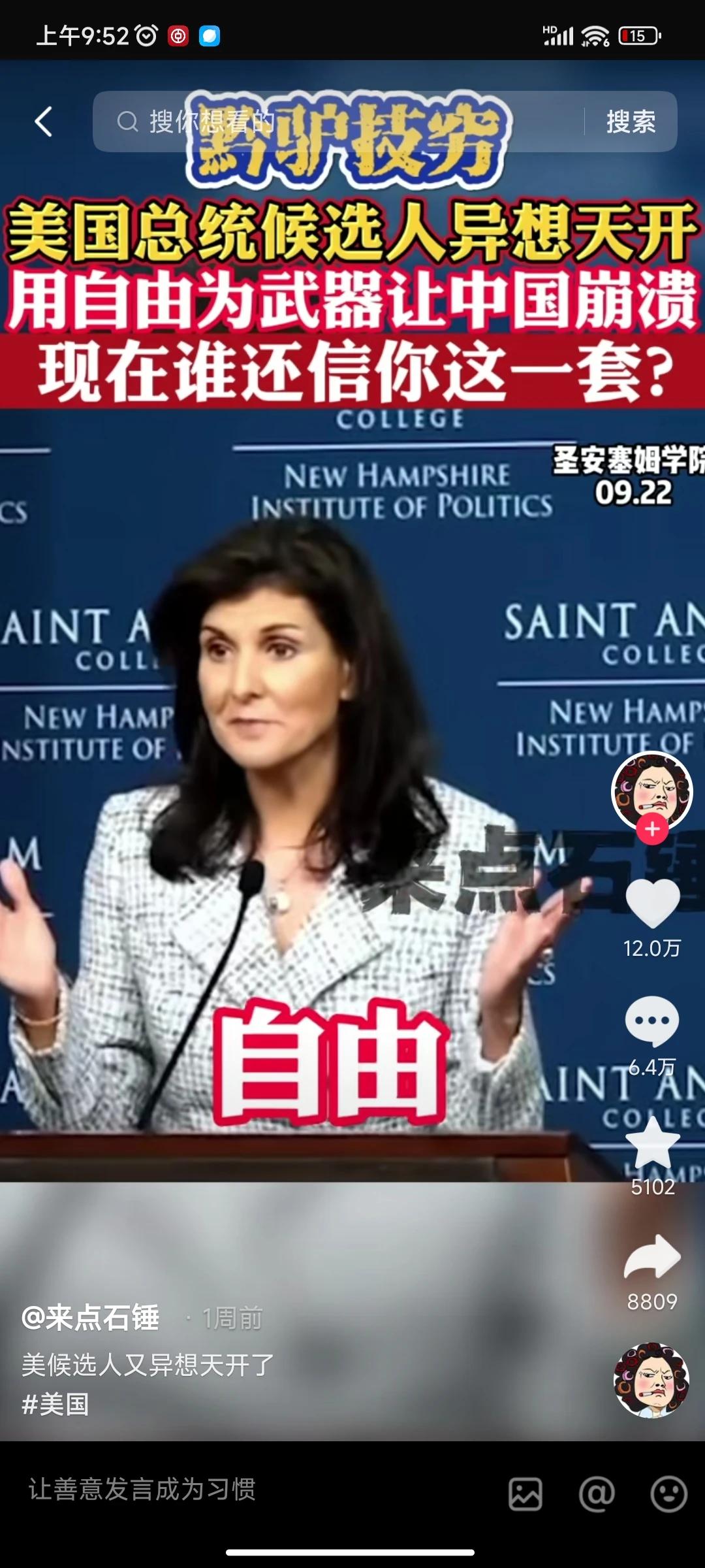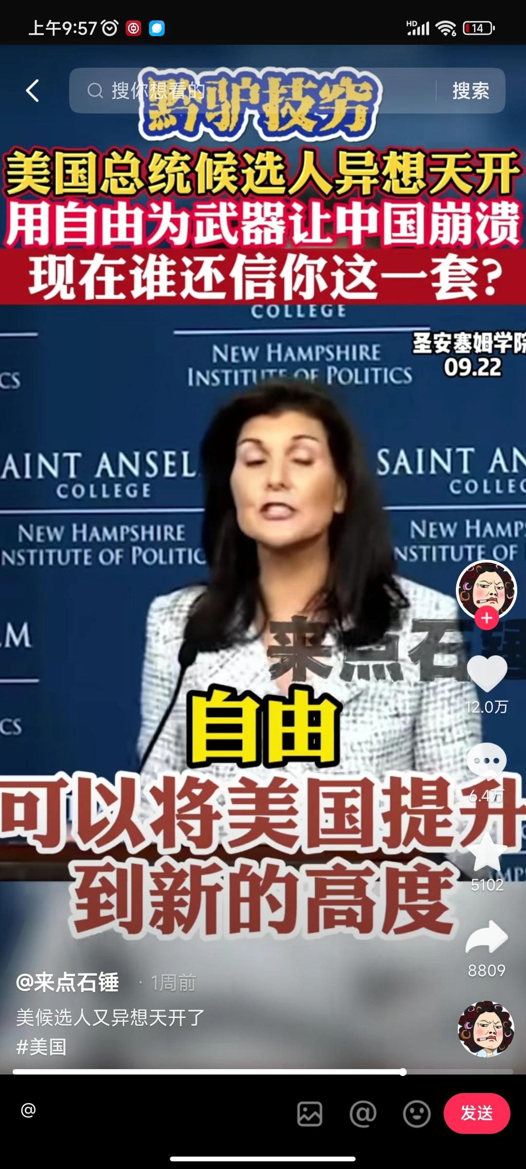 印度裔美国女议员黑莉要竞选下届美国总统,而且声称自由是大漂亮的终极武器,自由可以像干翻毛熊一样干翻兔子[捂脸] 不愧是印度裔美国人,就和打长津湖前的陆战一师,以及1962年主动挑起战争却打成首都新德里保卫战前的印度一样。自信不得了,双buff叠满了属于是[尬笑] 最绝的是那句《自由可以将美国提升到新的高度》 ,确实嗷。美国现在零元购,跨性别者搞的美国乌烟瘴气。嗑药者满大街都是,帮派势力泛滥,确实新的高度了。[尬笑] 美国不如看看中国历史吧,一个王朝衰落时候两大特征,一个是接近300年大槛,世家横行霸道,贫富差异巨大。另一个是民间魑魅魍魉尽出,各种群魔乱舞。 巧了大漂亮全凑齐了,从历史角度来看,美国要想好不是对抗中国,而是应该匡扶自己回归正道。 美国的正道起码不应该是嗑药者满天飞,枪击案天天有,跨性别者各种作妖,零元购随处可见,不是么?[尬笑] #历史#