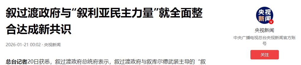 央视新闻:叙过渡政府与“叙利亚民主力量”就全面整合达成新共识