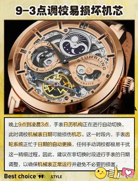 带有日历功能的手表,在晚上9点至凌晨3点之间被称为“调时禁区”。此时齿轮正在为跳历做准备,若手动强制调校,可能导致日历卡顿、齿轮损伤。不同机芯的跳历机制不同,有的瞬间完成,有的缓慢过渡,但在此期间干涉指针运行,都属高危操作。养成习惯:白天调时间,晚上让手表自己安静工作。