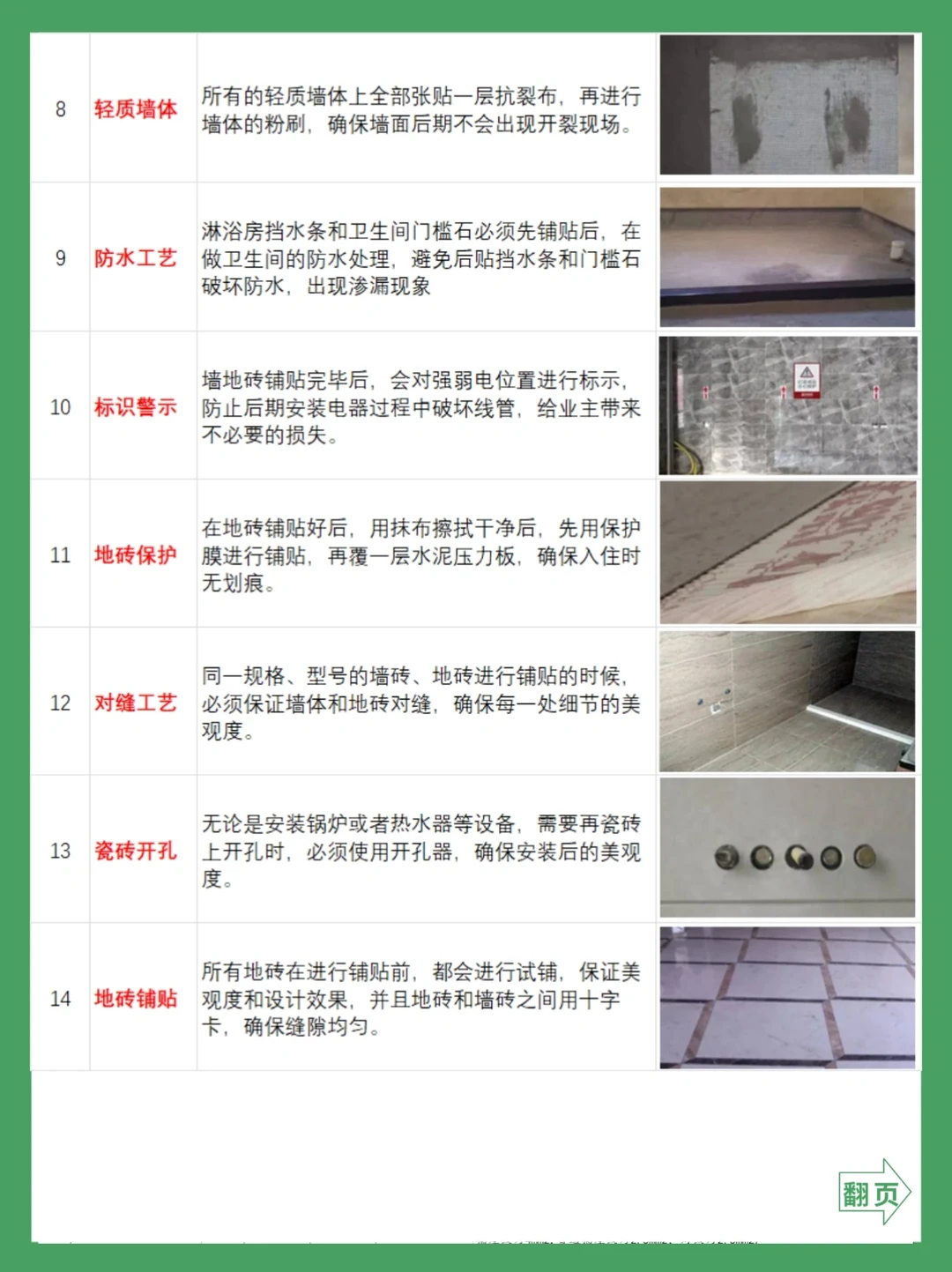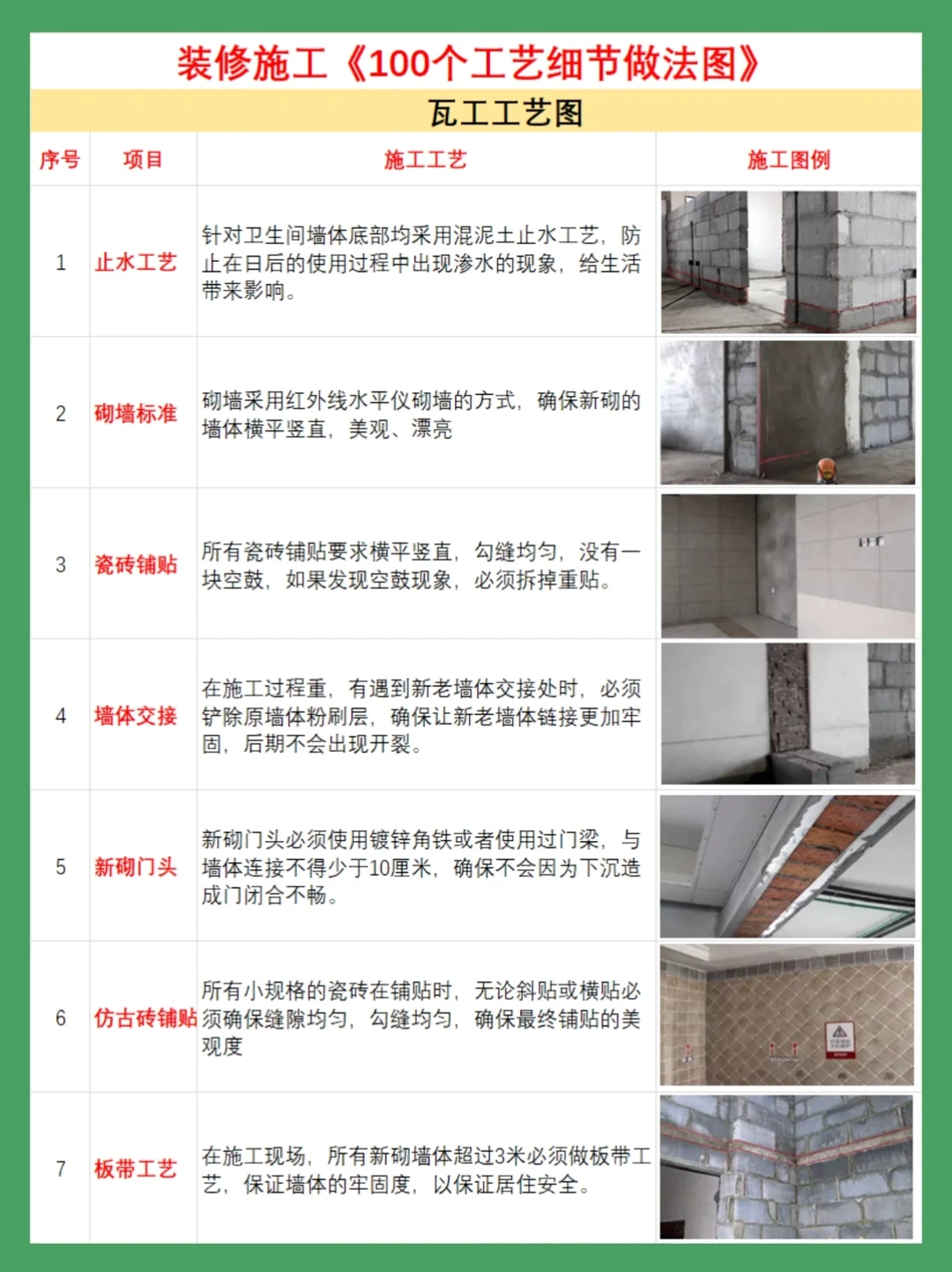2⃣《瓦工施工工艺图》以贴砖为例,要求贴砖贴完横平竖直用2米靠尺验收,误差在2毫米之内,墙地贴砖空鼓不超过10%!