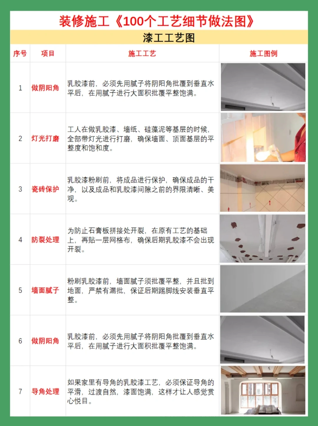 4⃣《漆工施工工艺图》漆工施工流程,墙面找平,一底漆两面漆,注意打磨平整,验收标准!