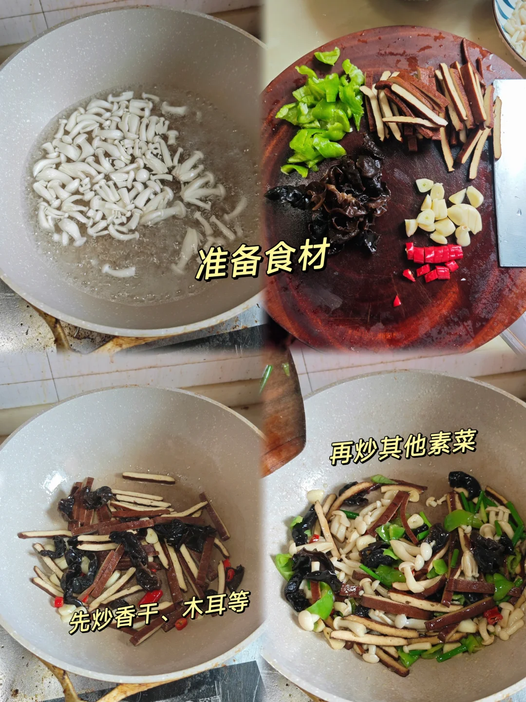 🍄女朋友说要减肥,以后家里不准吃肉🍖,那喜欢吃肉的我可真难住了,还好还有香干,蔬菜中的肉食,搭配点白玉菇倒也是蛮好吃的。 · ✅主要食材 白玉菇 香干 木耳 青椒 · ✅制作步骤 1⃣️白玉菇先焯水,其他食材洗好切好。 2⃣️锅里热油,先把蒜片青红椒爆香,再放入香干炒。 3⃣️加少许水,一点耗油,焖煮下就可以出锅了。 · 十分清爽下饭的一道时蔬,适合想要减肥的人。 ·