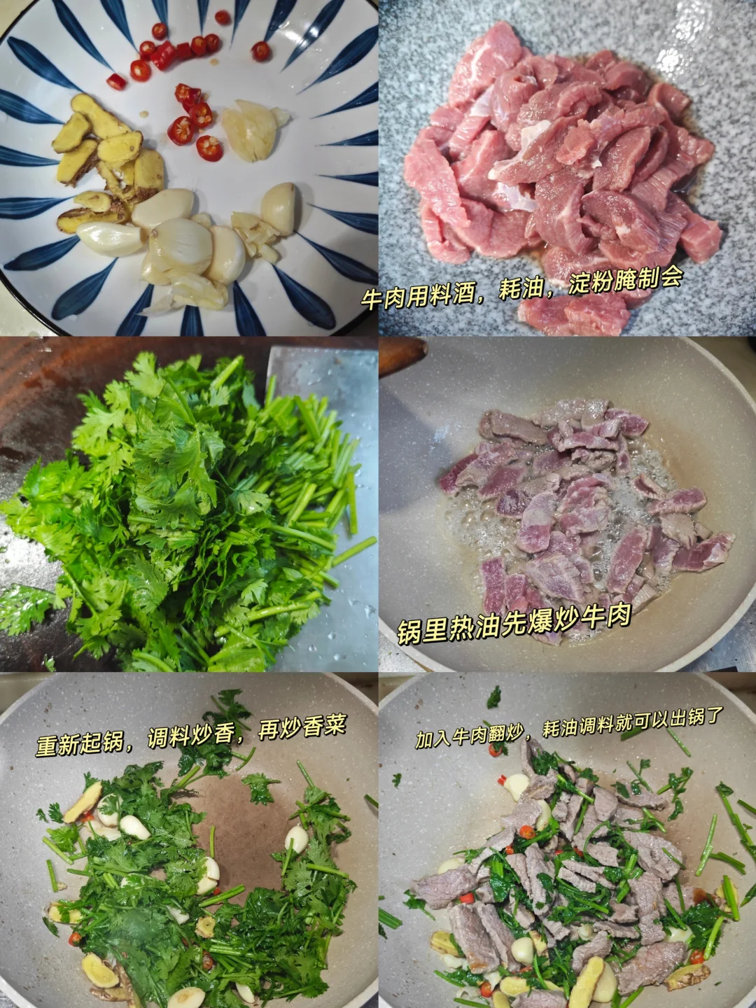 🐮牛肉有丰富的蛋白质,脂肪少,女朋友天天喊着要减肥,炒个牛肉肯定再适合不过了。 · ✅主要食材 鲜牛肉 香菜 蒜姜 小米辣 · ✅制作步骤 1⃣️牛肉切小片,在碗里加料酒耗油淀粉腌制下。酸菜洗净切好,其他调味料也准备好。 2⃣️锅里热油,牛肉先炒至褪色。 3⃣️重新起锅,把调味料在锅里炒出香味,加入香菜翻炒。 4⃣️再加入牛肉翻炒一下就好了,加点耗油可调味。 · ⚠️切薄片,牛肉很容易炒熟,所以这道菜上菜速度很快。 ·