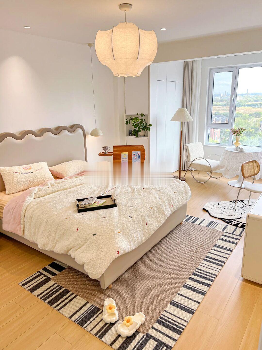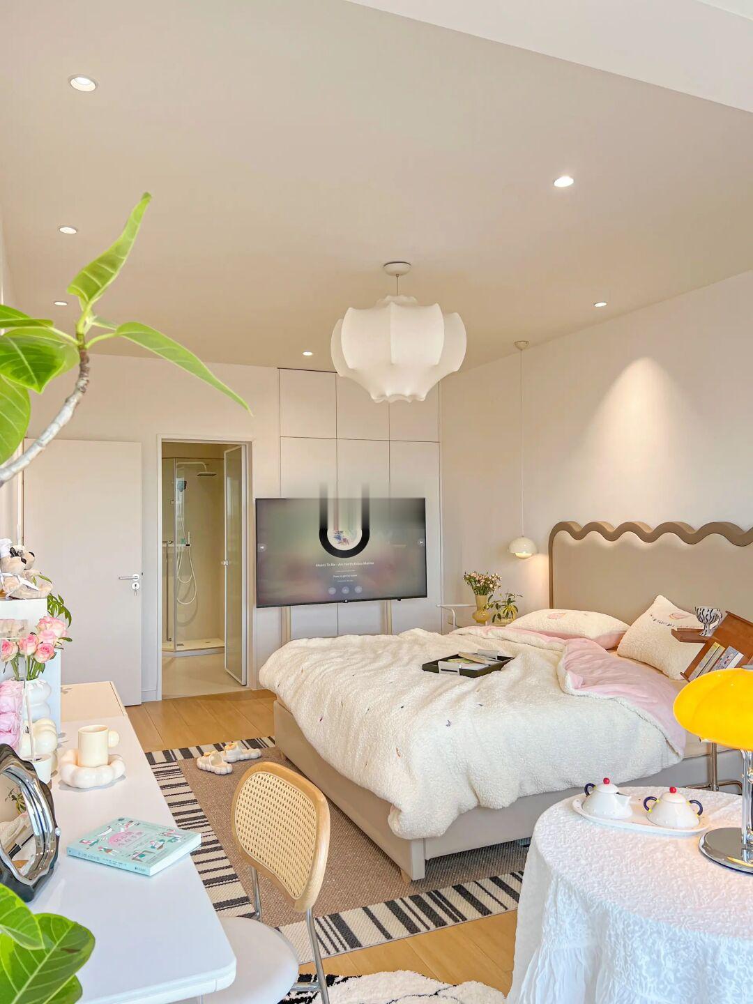 卧室面积有20㎡,开间3.6m,为了能最大程度显得通透,地面通铺了木纹砖,墙面是白色乳胶漆,大件家具基本以奶油白为主,整体的风格是奶油风