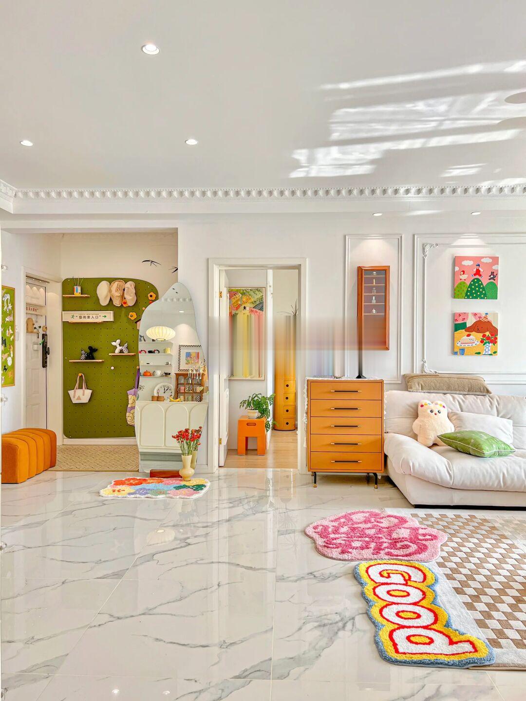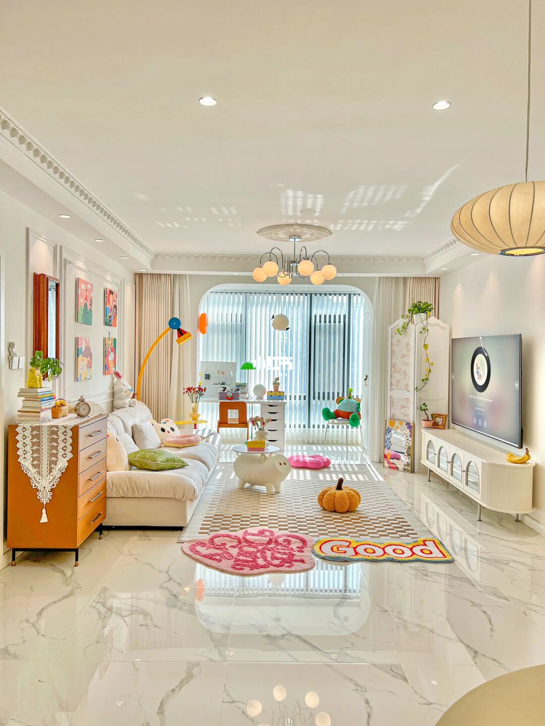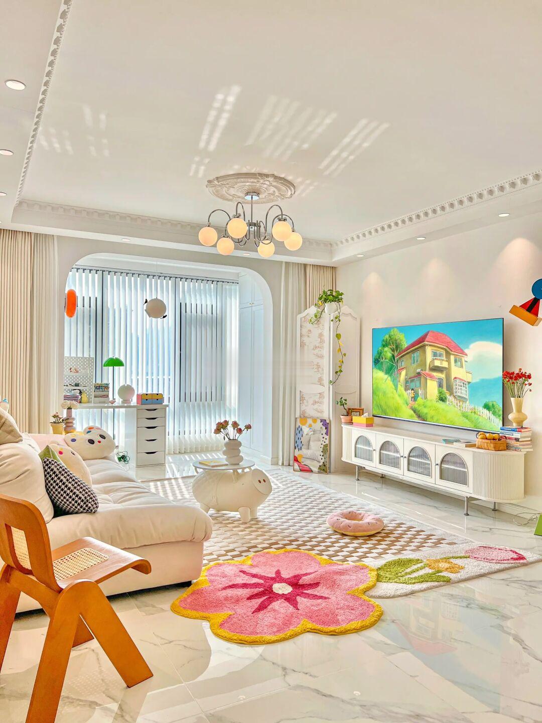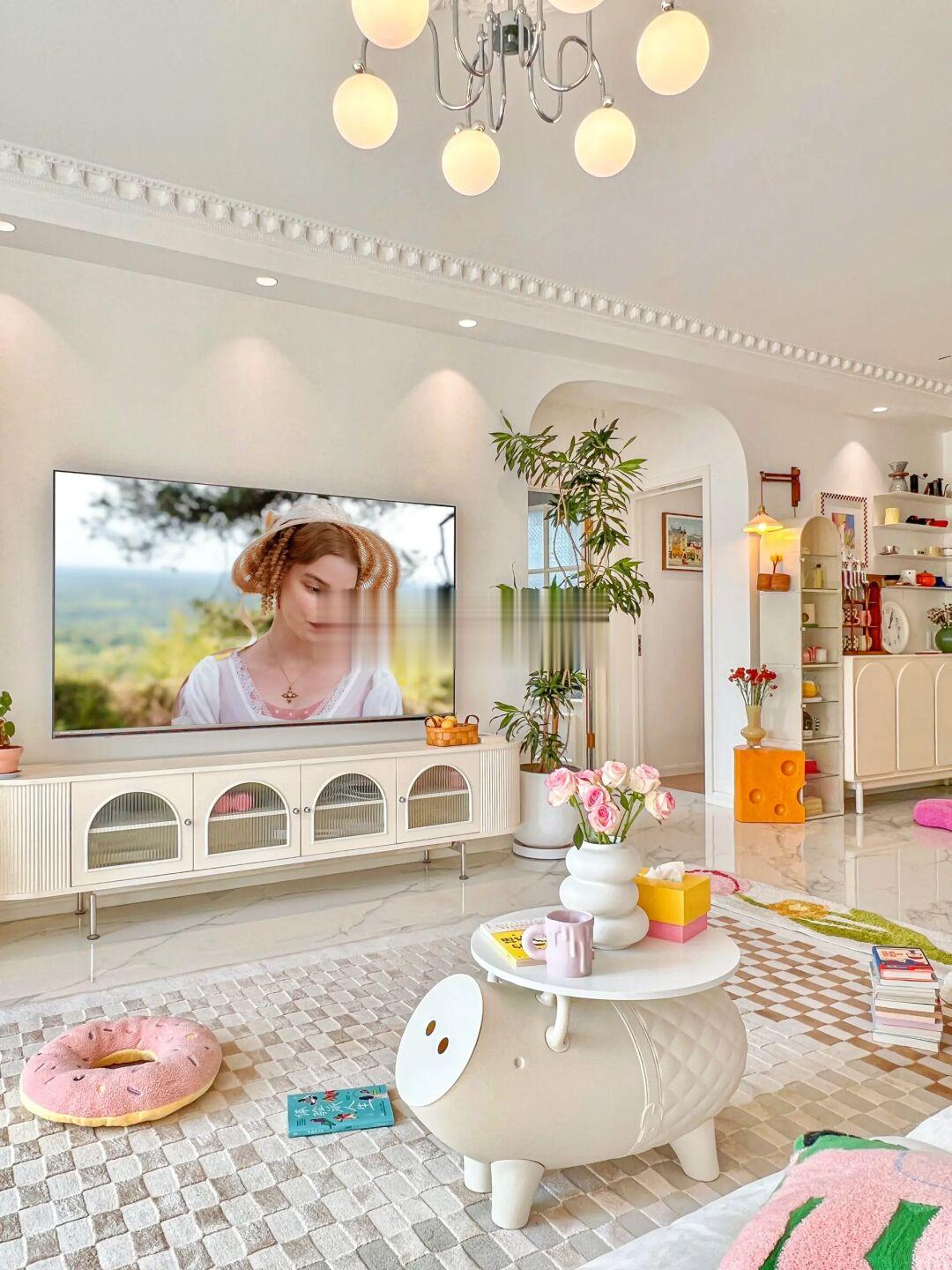 毕业后的第二年有了属于我们的家 实现了大学时候的心愿 诺大的城市终于有了一盏灯为我们而点亮 建筑面积116平,套内93平 硬装简简单单,没有过多的修饰 让软装发挥无限的可能 白墙+白地让小户型更显通透明亮 银白色的蝴蝶结吊灯在客厅中央闪闪发光 可爱的小猪茶几虽体积小但能装且功能多🐖 我家电视背景墙就是一面大白墙 电视是75寸的海信E7K 对于开间4米的空间来说距离刚好 最盼着周末休息的时候和爱人窝在沙发里看电影🎞️ 清晰的画面大大提升了观影幸福感,而且音质非常棒 让我们在家就能享受到影院的视听效果 不得不感叹: 大电视真香![派对R] 所谓幸福并不是住豪宅吃大餐 而且拥有一个温暖的家和贴心的爱人💞