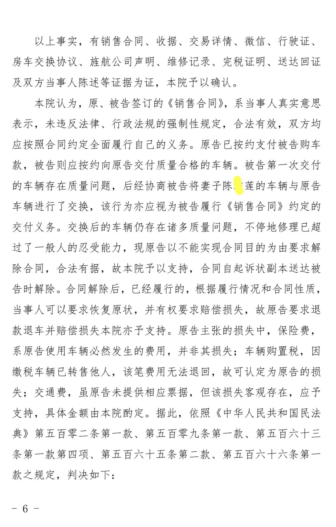 判决书 : 老姜胜诉!@豪哥房车行 你反复逼我起诉的,满足你了! 去年一整年我都多次公开宣布:“我一不要退车、二不要赔偿,我只要你兑现和解时承诺的约定、诚恳道歉”,结果人家就是不兑现、公然违约。 然后居然还持续赤裸裸撒谎、污蔑了我整整一年,今年四月份更是公开逼我“你这已经是二手车了,法院不会给你立案的,你明知道无法胜诉,有本事你去起诉、起诉、起诉!只要判了你赢,我就给你退车!” OK,那就起诉呗! 我都已经准备舍弃这台车了,一台车而已,为了一台车去闹去起诉,我都觉得丢人、不值当。但你持续撒谎污蔑我,这是我无法接受的。但我摆证据揭露他撒谎,他就扯我打不赢官司、就是为了讹诈、车没问题、都是我的问题,你连给我换车都说成是你老婆的个人行为,这是全网都知道的事情,你是真有脸呀[赞] 好,那我就先只针对质量问题起诉,我先堵住你的嘴,现在法院判了,你爽了吧?