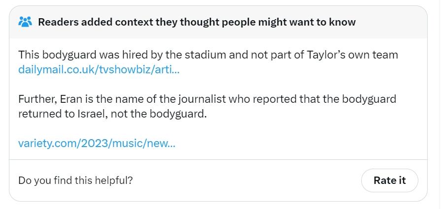 以色列官方拉 Taylor Swift 下水,希望获得霉粉支持! 以色列官方账号称:“霉霉的私人保镖从时代巡演 The Eras Tour 中辞职,回以色列加入军队。” 此后引起了大量霉粉的反感,认为发这样的内容只是想要捆绑霉霉的粉丝,希望获得舆论优势。 对此,霉粉澄清到,这个男的不是私人保镖,而是演唱会的安保人员,属于体育馆雇佣的安保人员不是 Taylor Swift 的团队自己请的,这次的安保人员找了第三方外包公司负责,这个男的立场不相当于 Taylor Swift 的立场,希望以色列不要拉 Taylor Swift 下水。