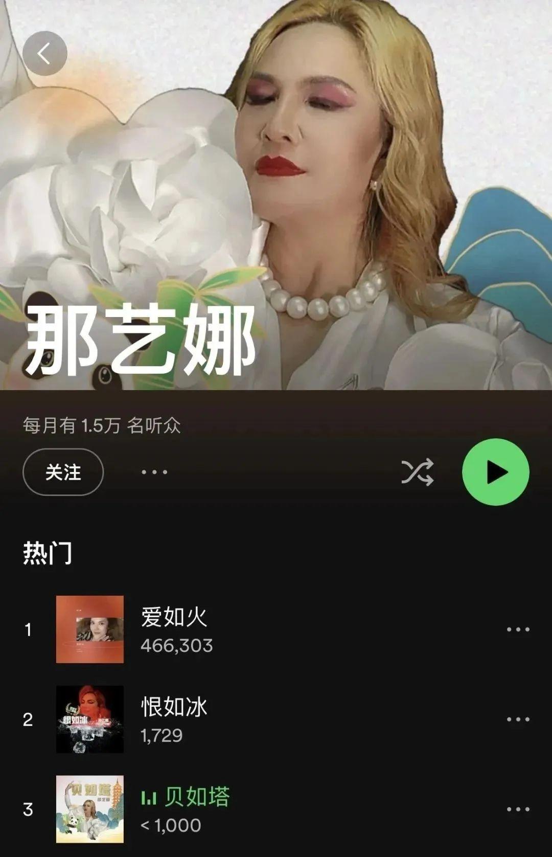 内娱爆红炸子鸡“大中国娜娜”那艺娜凭借一首《爱如火》迅速在网络走红,成为当下最炙手可热的明星之一。这首歌曲不仅在国内各大音乐平台上取得了优异的成绩,在海外也获得了不少关注。 最近有网友发现,那艺娜居然还有 Spotify 页面,而且在整个海外地区,热门单曲《爱如火》播放量已经达到46万次。这是一个非常不错的成绩,尤其是考虑到那艺娜的歌曲大部分都是以中文演唱的。