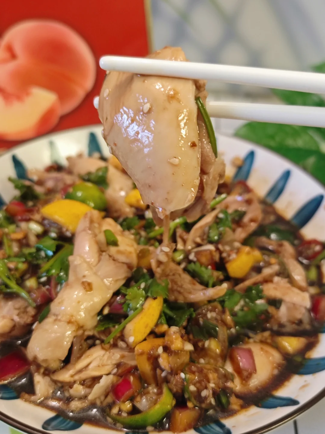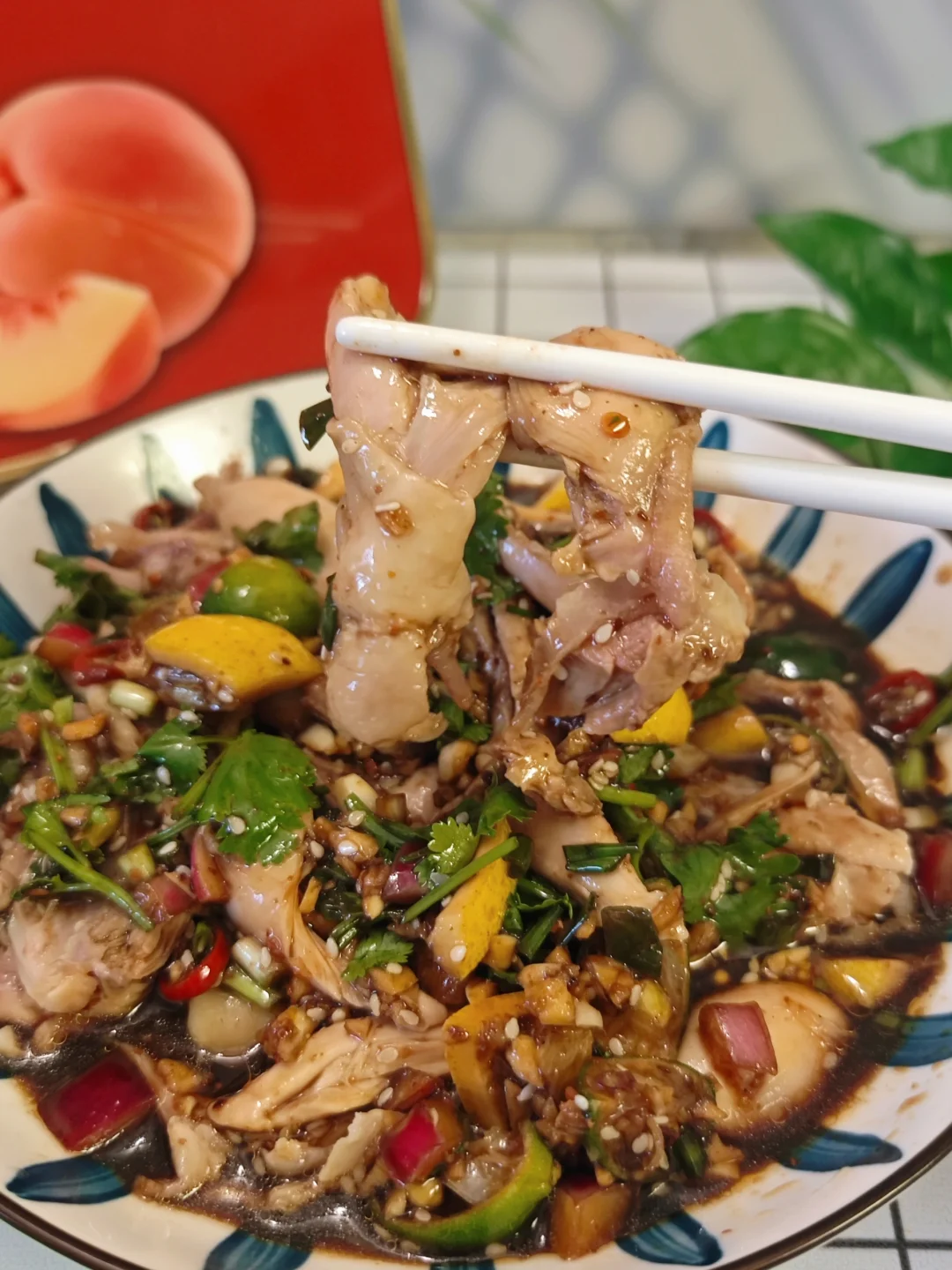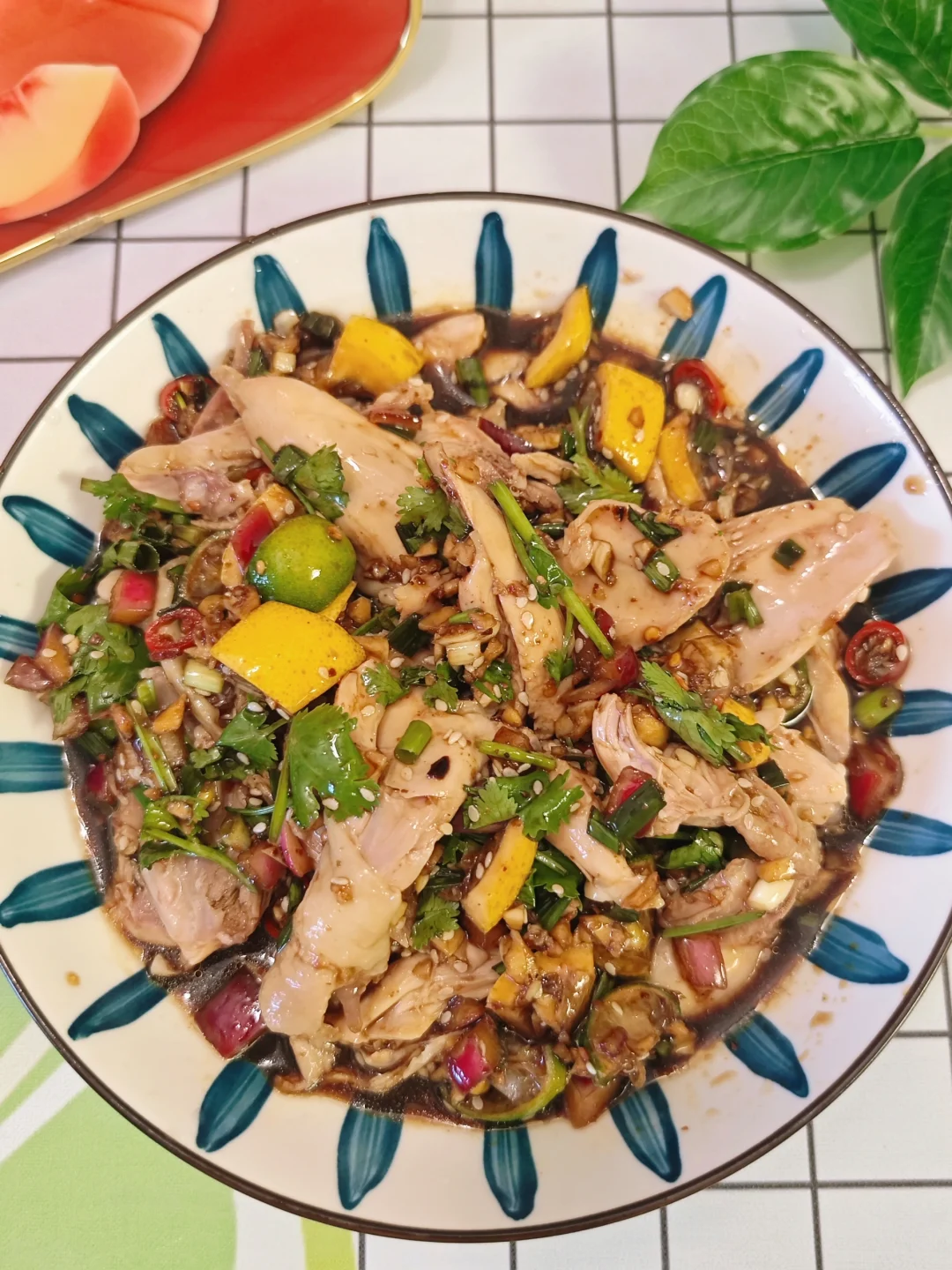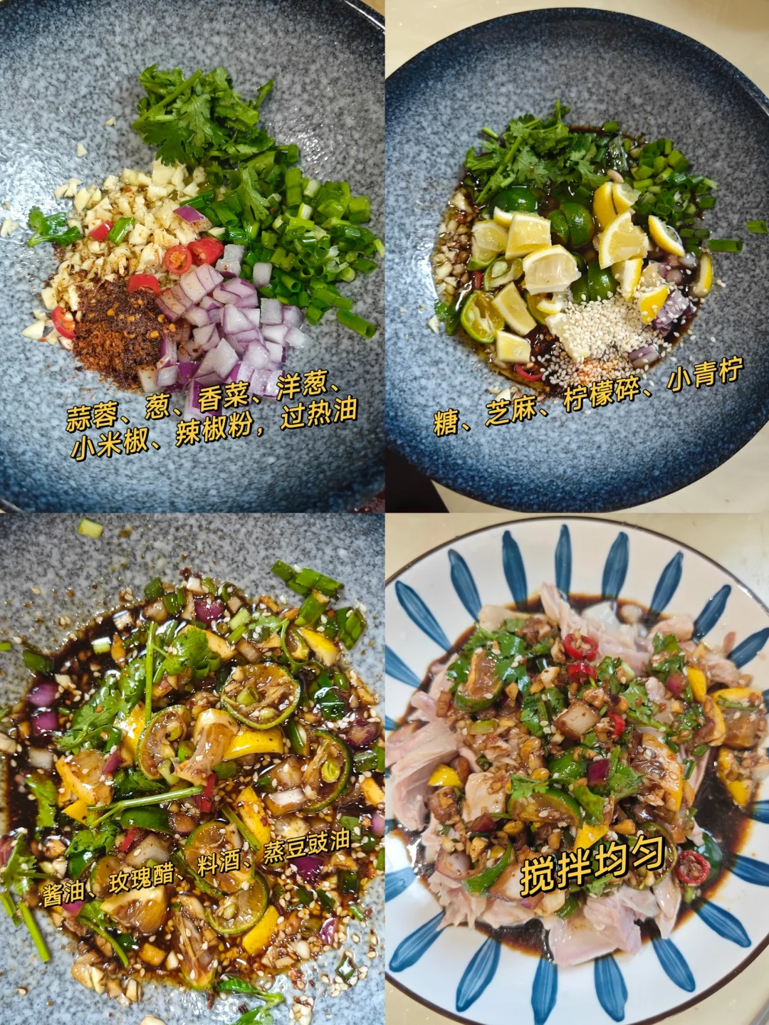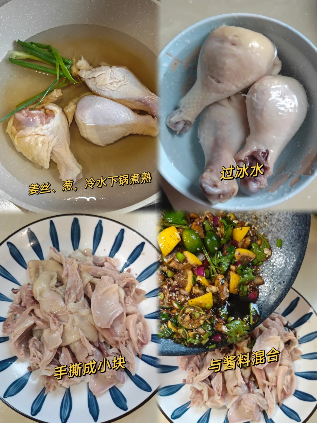 凉拌手撕鸡可是夏天的下饭神器,今天我干了四碗饭! · ✅主要食材 鸡腿、葱蒜、香菜、柠檬、小青柠 · ✅制作步骤 1⃣️鸡腿冷水下锅,加入姜丝,料酒,葱去腥,煮熟。 2⃣️煮鸡腿的时候,我们可以准备酱料。详见图5⃣️。 3⃣️煮好的鸡腿过冰水,冰箱冷藏20分钟更好,撕成喜欢的大小,与酱料搅拌均匀即可。 · 做法超简单,但是也超好吃!