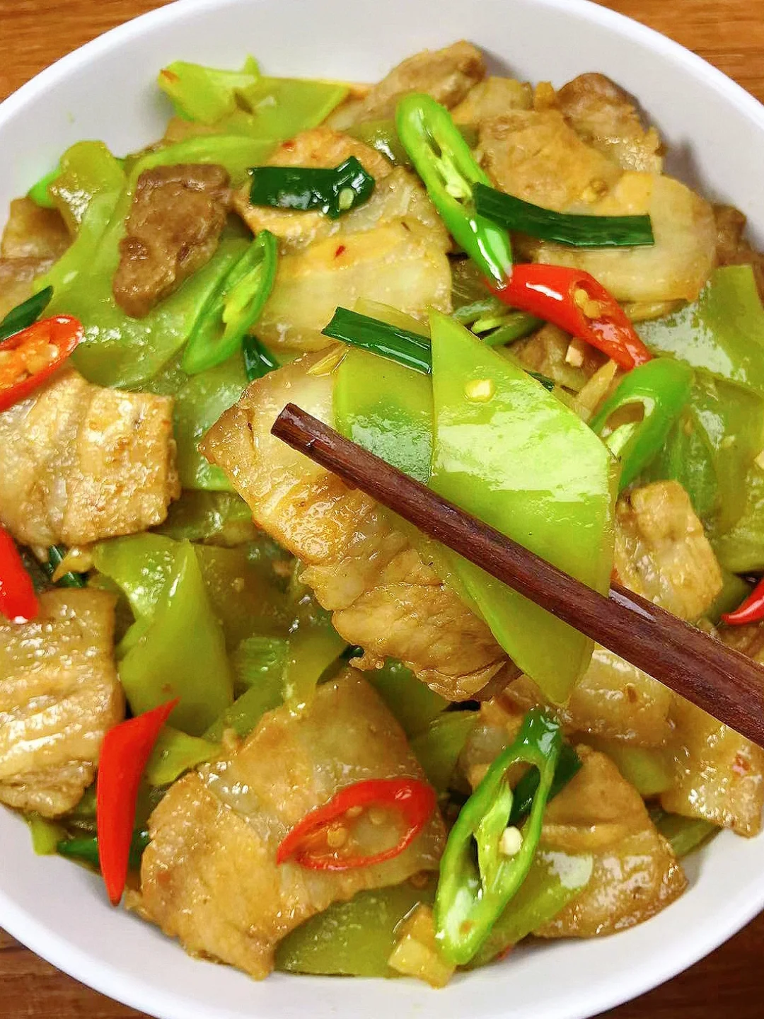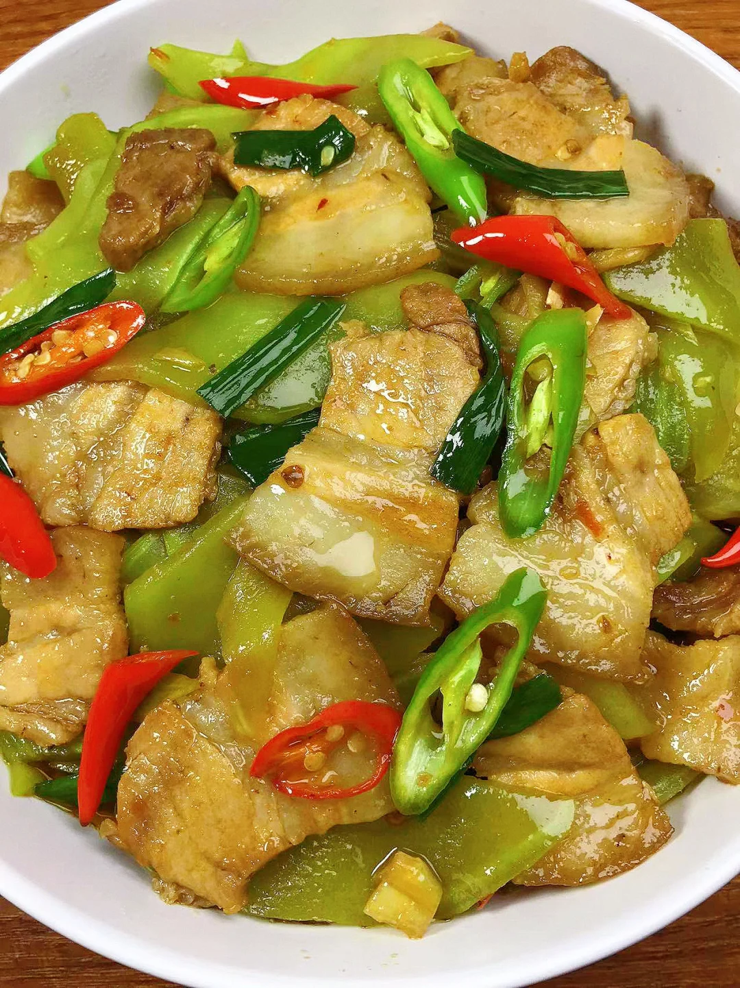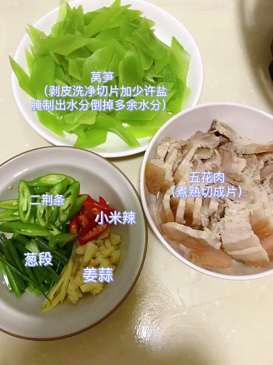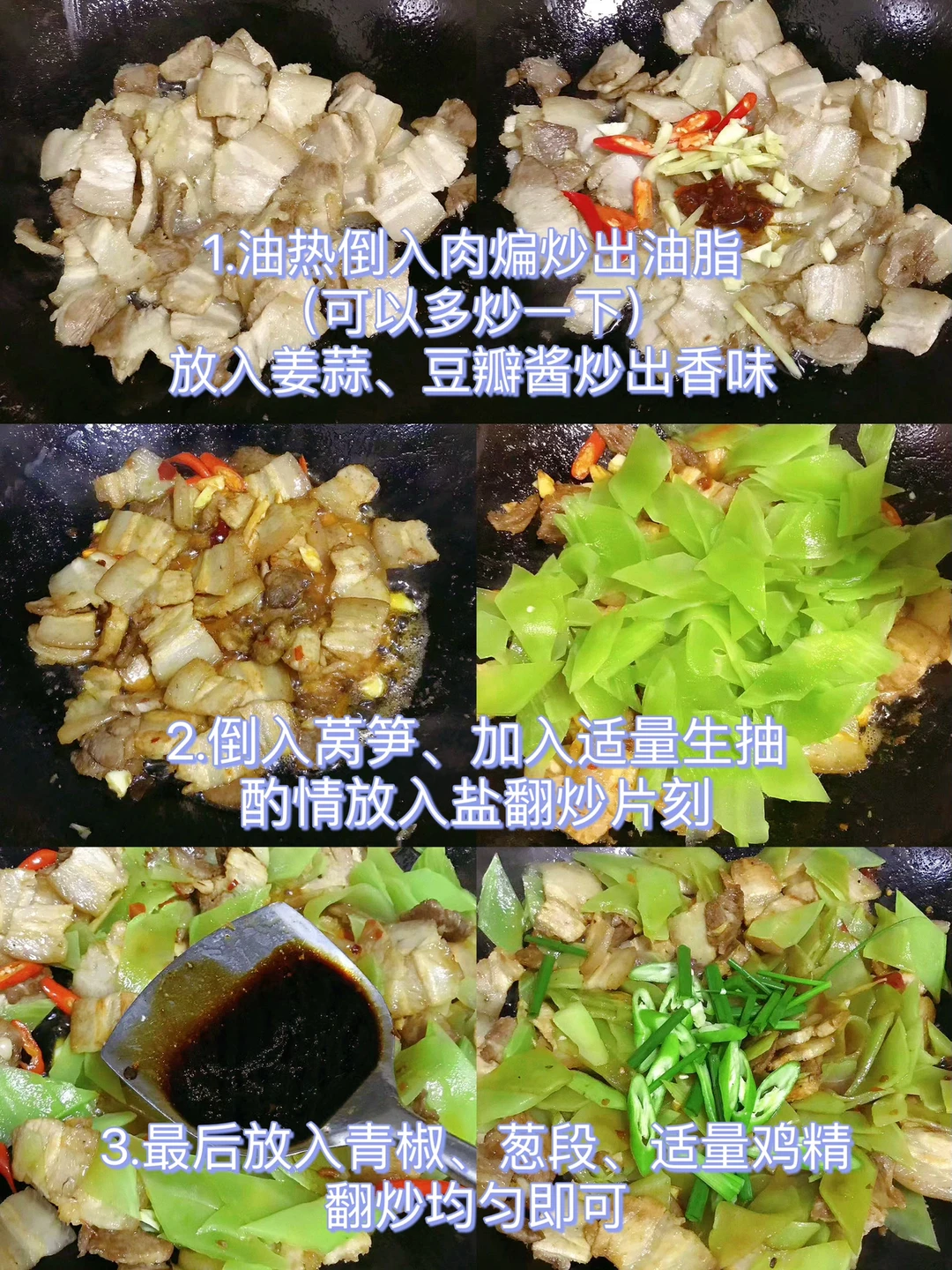 [赞R]今天分享一款五花肉炒莴笋!好吃下饭,太香了!喜欢的赶紧试试吧! [赞R]食材:莴笋、五花肉、二荆条、小米辣、葱姜蒜 [赞R]做法: 1.莴笋剥皮洗净切片放少许盐腌制出水分倒掉多余水分;五花肉洗净煮熟切成片 2.油热倒入肉煸炒出油脂(可以多炒一下)放入姜蒜、豆瓣酱炒出香味,倒入莴笋,加入适量生抽,酌情放盐翻炒片刻 3.最后放入青椒、葱段、适量鸡精翻炒均匀即可