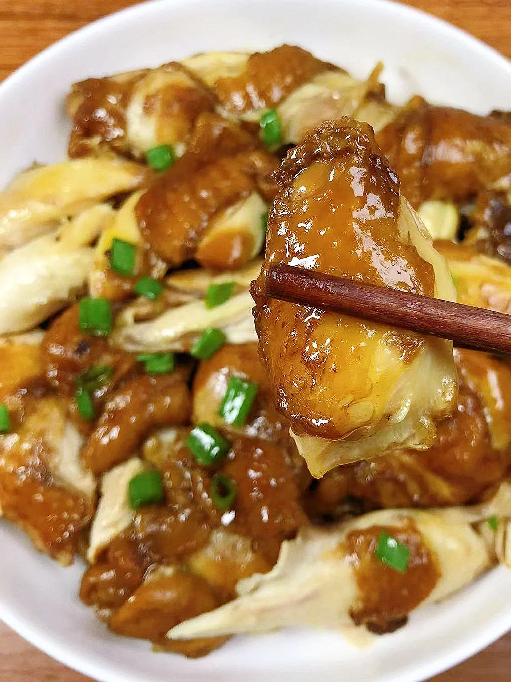 [赞R]今天分享一款酱油手撕鸡!酱香浓郁,超级好吃!喜欢的赶紧试试吧! [赞R]食材:鸡腿、葱姜蒜、酱油 [赞R]做法: 1.鸡腿洗净沥干水分;酱油半碗,葱姜蒜切好备用 2.油热放入葱姜蒜炒香,放入鸡腿稍微煎一下(让皮收紧)捞出鸡腿备用,锅中倒入酱油、2碗清水、适量胡椒粉、几颗冰糖烧开 3.放入鸡腿中火煮10分钟,翻面继续煮10分钟,最后大火收汁,出锅撕成块即可