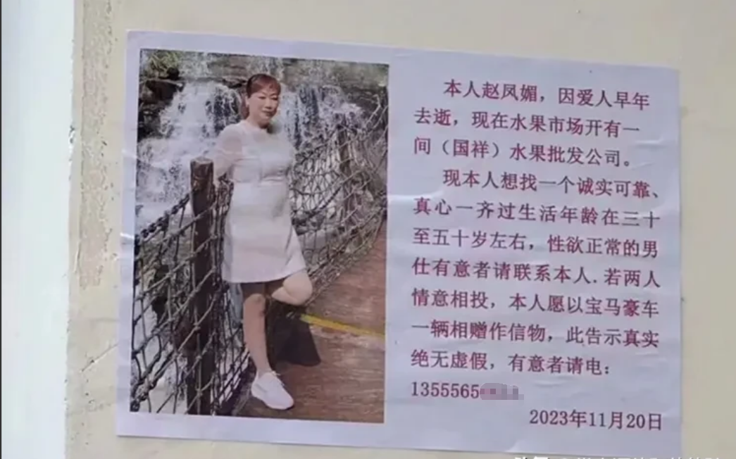 征婚奇葩要求!对夫妻生活要求质量高。赵女士四十多岁,丧偶,经营水果批发生意。收入丰。择偶要求:30岁-50岁的男子,身体欲求正常。若成功则赠宝马车一辆。很正常,说得直白。
