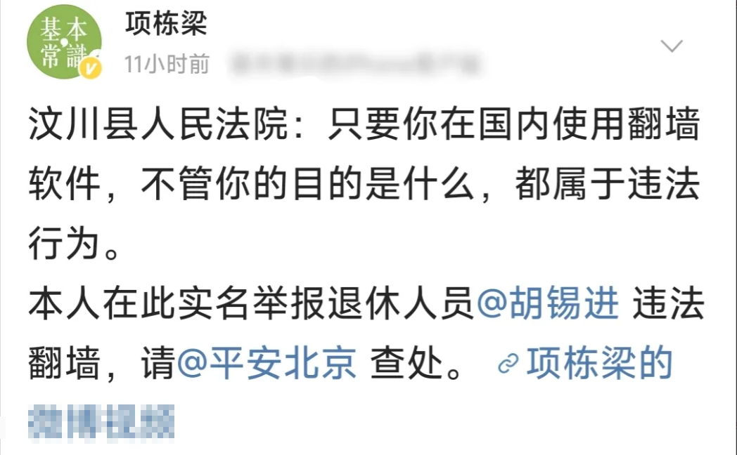 近日网络大V项栋梁实名举报胡锡进违法翻墙,称只要在国内使用翻墙软件,不管出于什么目的都属于违法行为。之前胡锡进经常在国外平台发布信息,有网友怀疑其用了某种特殊方法。目前胡锡进还未就此事作出回应,不知道老胡这次要怎么应对,还能平安脱身吗?