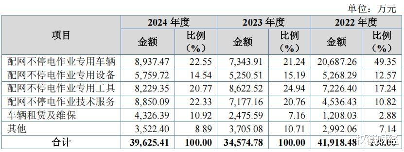 公司主营业务分为配网不停电作业专用车辆、配网不停电作业专用设备、配网不停电作业专用工具、配网不停电作业技术服务、车辆租赁及维保等。