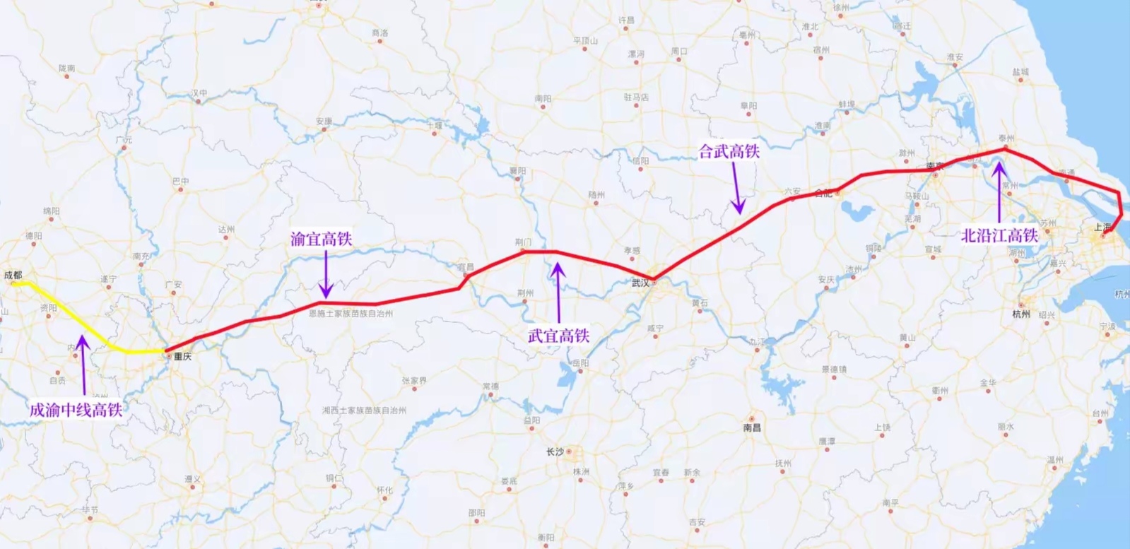 2016年八纵八横高铁主干道规划正式发布,沿江通道串联长三角地区和成渝地区,从规划上来看沿江通道是一条复合通道,在多个城市分为多个线路走向,2019年正式确立沪渝蓉高铁作为沿江通道主线。沪渝蓉高铁自东向西由北沿江高铁、合武高铁、武宜高铁、渝宜高铁和成渝中线高铁组成,全线设计时速350km,全长约2100km,承担着上海至成都8小时内抵达的重任。