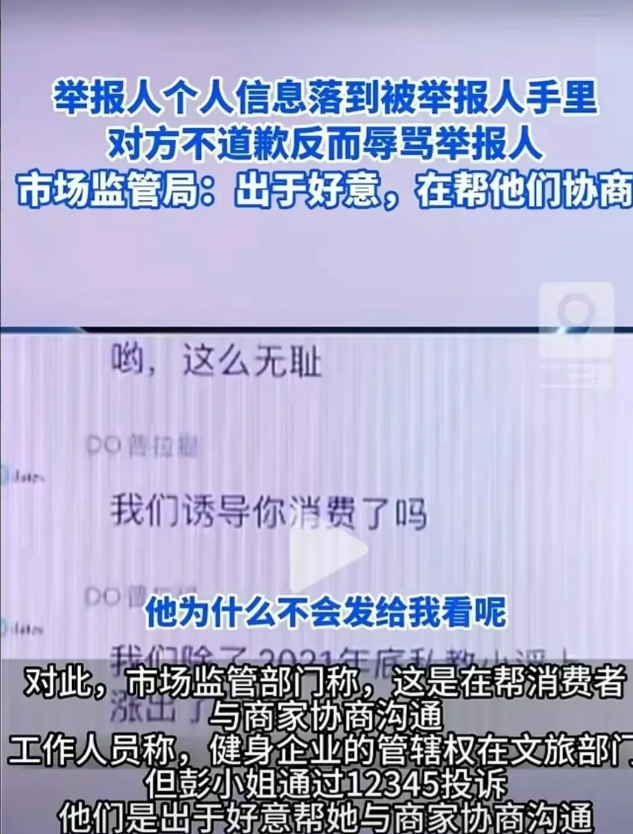 上海普陀区,女子和健身房发生纠纷,要求退费遭到拒绝后,她求助于当地市监局。谁知,市监局不仅没有解决问题,反而把女子的举报信息和个人信息全部告诉了健身房,女子也因此遭到健身房的辱骂。女子向市监局讨要说法,工作人员的解释却让人大跌眼镜! (案例来源:澎湃新闻) “嘟…嘟…嘟…”手机振动个不停,一看号码,彭小燕慌了神。这几天,她非常害怕陌生电话。
