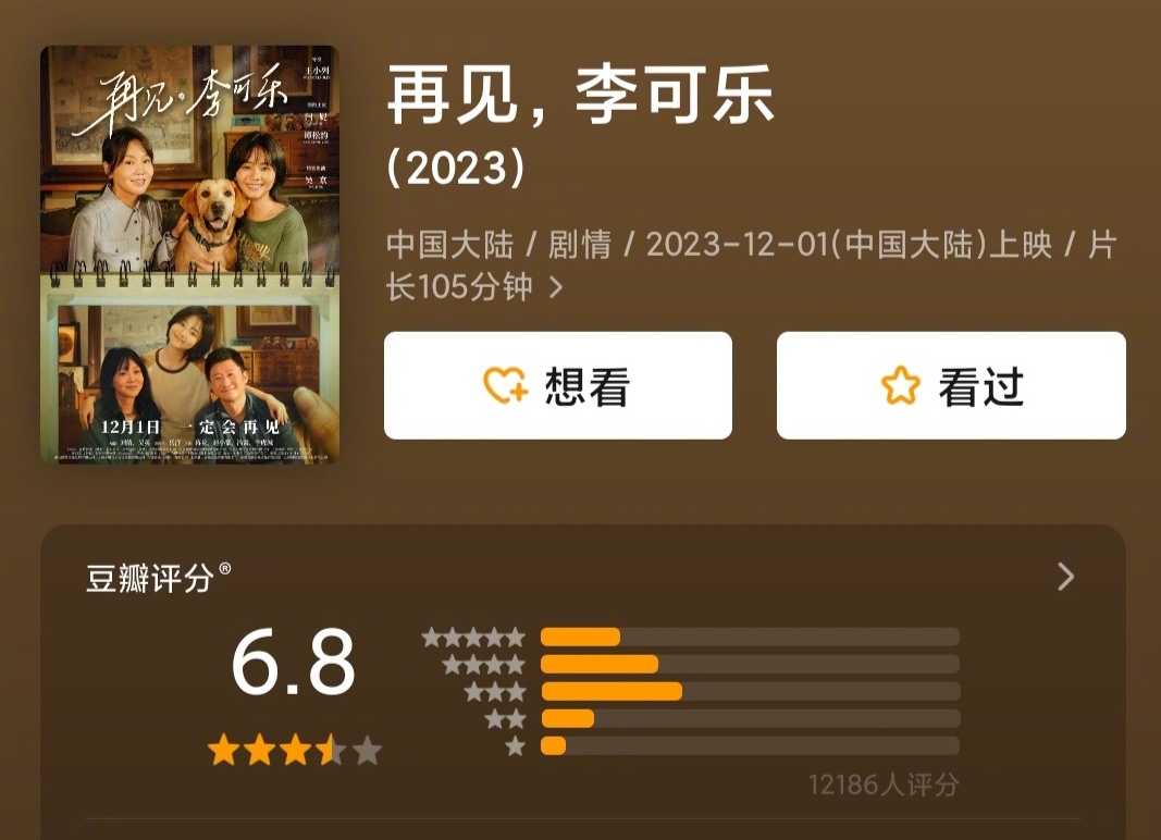 由闫妮、谭松韵、吴京等主演的电影《再见,李可乐》豆瓣开分6.8,1.2万人打分。