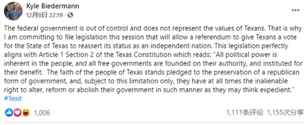 刚美国传来了特大喜讯你支持吗?美国德克萨斯州脱美独立迈出了一大步!尽管美国法律明确规定严禁各州闹独立,但是按照美国政府在全球范围内的新玩法,投票表决通过就可以独立。这就是美国标榜的西方民主自由,也是美国干涉别国内政惯用的伎俩。 12月6日援引美国《新闻周刊》报道称,德克萨斯民族主义运动宣布已收集到足够多的请愿签名,可在即将举行的2024年3月共和党初选中将该州脱离美国问题列入选票。追求独立自由的德克萨斯人们正迎来光明的前途。 脱美独立运动推动者之一的得克萨斯州共和党议员凯尔·比德曼称,除了德克萨斯州之外,还有好几个州对独立公投感兴趣。可以肯定的是,如果德州脱美成功,美国将面临分崩离析的多米诺骨牌效应。给勤劳勇敢的德州人民点个赞! 19世纪初还是墨西哥领土一部分的得克萨斯,吸引了大量美国移民。这些移民与墨西哥政府之间的紧张关系最终导致了1835年的得克萨斯革命。在随后的几年里,得克萨斯独立战争爆发,经过一系列战役,包括著名的阿拉莫之战(Battle of the Alamo),德克萨斯军队于1836年4月21日在圣哈辛托战役中取得了决定性的胜利。同年4月21日,得克萨斯宣布独立,并成立了得克萨斯共和国。这个独立国家得到了包括法国、英国、俄罗斯帝国以及后来的美国在内的许多国家的承认。直到1845年12月29日,得克萨斯才正式加入美国联邦,成为美国的一个州。