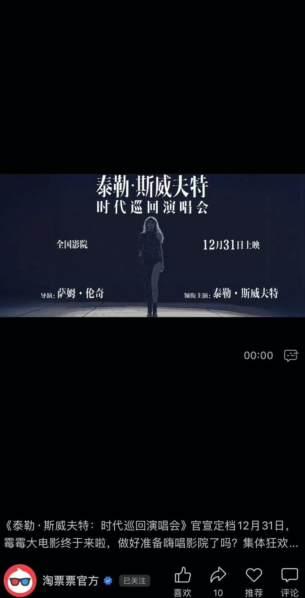 霉霉演唱会电影将在中国内地上映 淘票票官方秒删“霉霉”泰勒·斯威夫特演唱会电影《泰勒·斯威夫特:时代巡回演唱会》(Taylor Swift: The Eras Tour)定档预告! 该片大概率会上映,档期也应该是12月31日。
