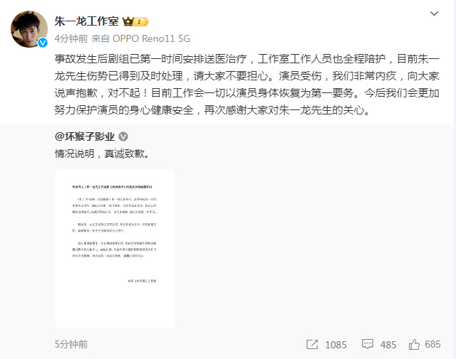 剧组回应朱一龙额头受伤 电影《负负得正》剧组发布声明:17日晚朱一龙在拍摄一场动作戏时额头受伤,剧组第一时间将其送往医院,伤口已得到及时处理,在此向朱一龙道歉,也向大家道一声平安。 朱一龙工作室也对此进行了回应,感谢大家对朱一龙的关心。