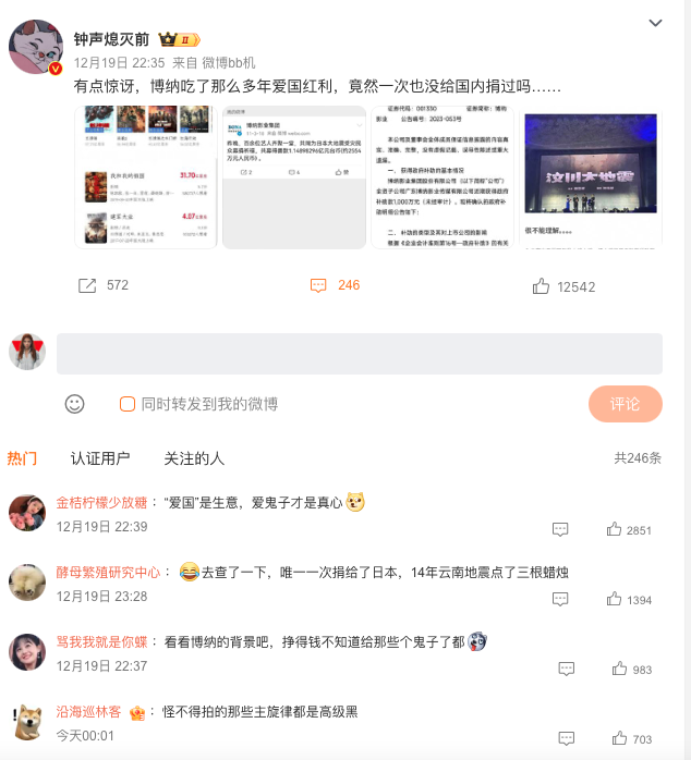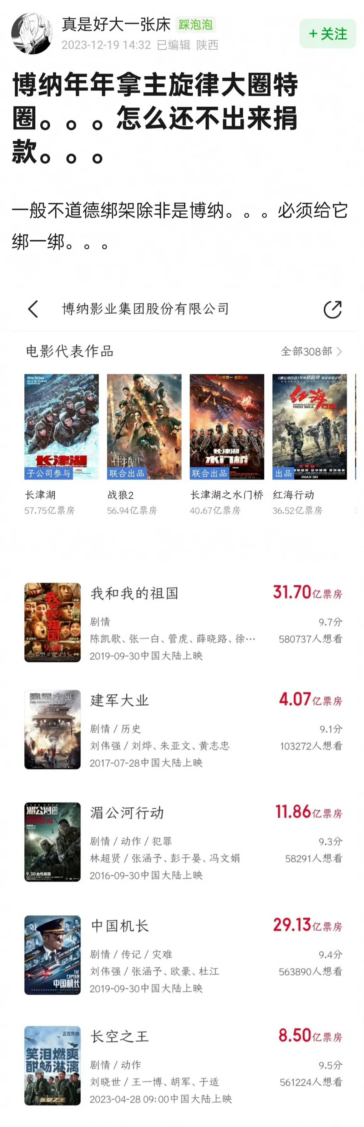 博纳捐款了吗 拍了众多爱国题材电影的博纳影业在甘肃地震后没有任何捐款,引发网友热议! 不少网友表示:博纳吃了那么多年爱国红利,竟然没给国内捐过一次款...据一些博主爆料,唯一的一次捐款(2500万)还是给日本的... 另外,博纳2023年三季度共申请过亿政府补助,还将拍摄电影《汶川大地震》。 现在这种做法引发众怒!现在好多人在喊话博纳,让其捐款!