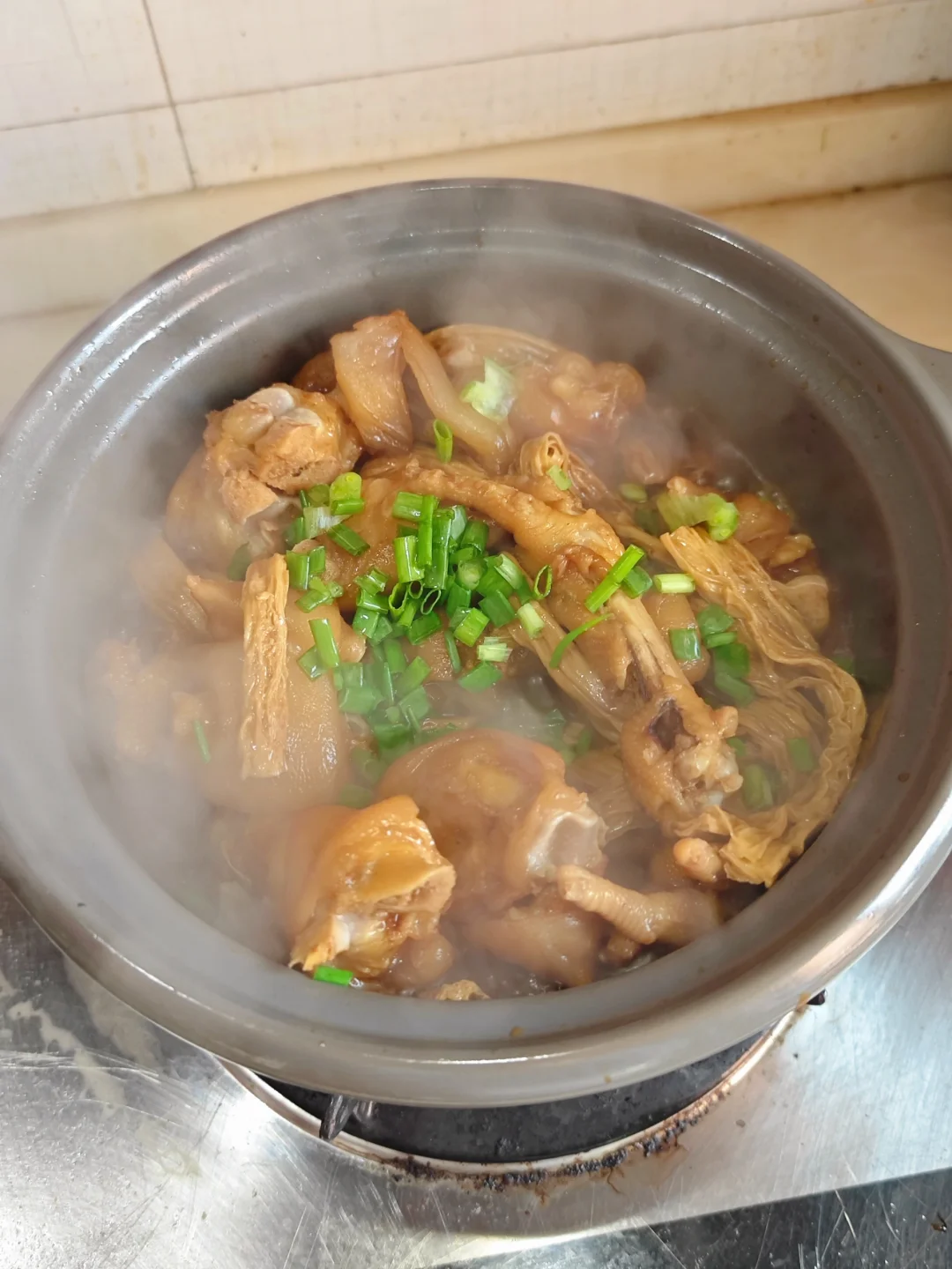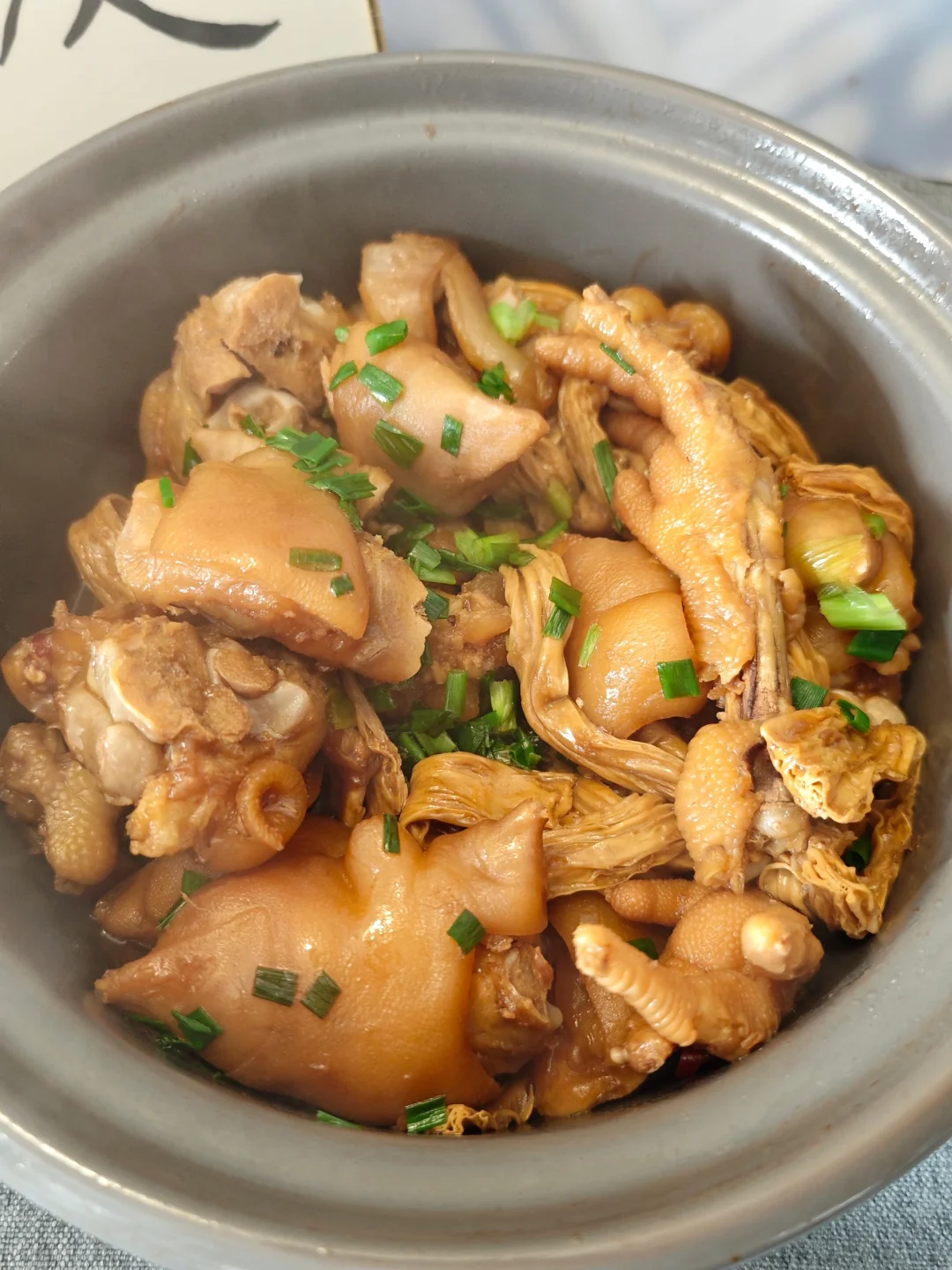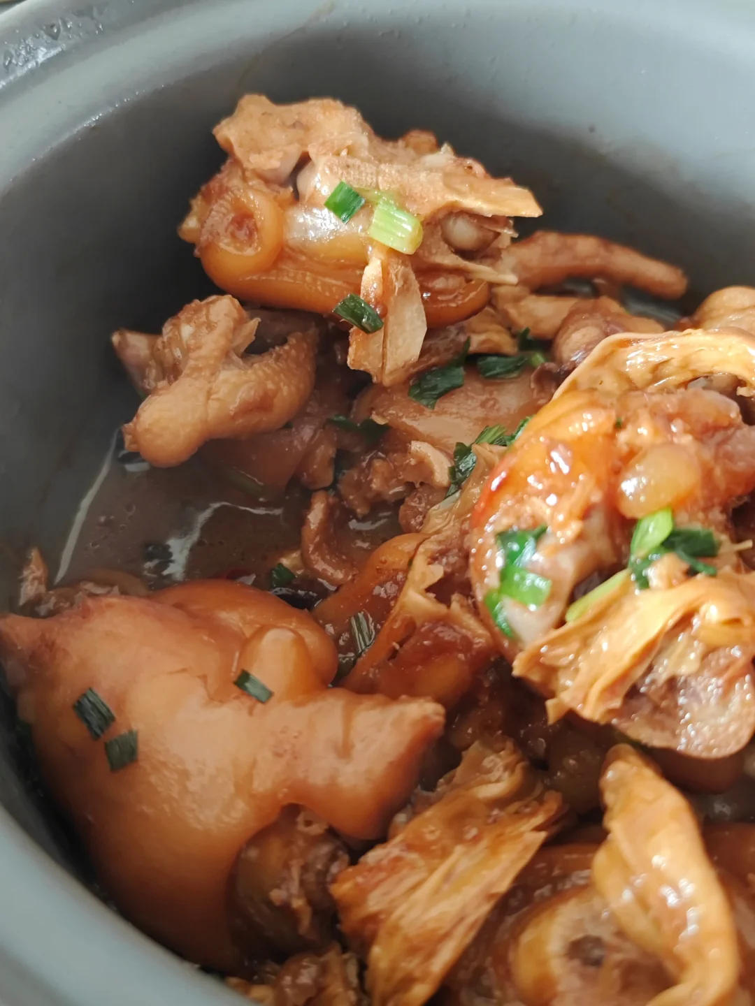 🐷天冷了就想吃肉,用砂锅炖一碗热腾腾的猪蹄鸡爪煲是真心不错的! · ✅主要食材 猪蹄 鸡爪 腐竹 葱花 · ✅制作步骤 1⃣️猪蹄,鸡爪处理洗干净后焯水,加料酒和姜葱! 2⃣️砂锅底留油,下蒜姜🫚干辣椒🌶️花椒炒香! 3⃣️加入猪蹄和鸡爪,生抽老抽耗油调味,啤酒一瓶炖煮半小时以上,中途可加一些冰糖和腐竹(吸收汤汁的腐竹老好吃了) · ⚠️也可以在高压锅里处理后再倒入砂锅🍲缩水,这样的猪蹄真的入口即化,软嫩无比!