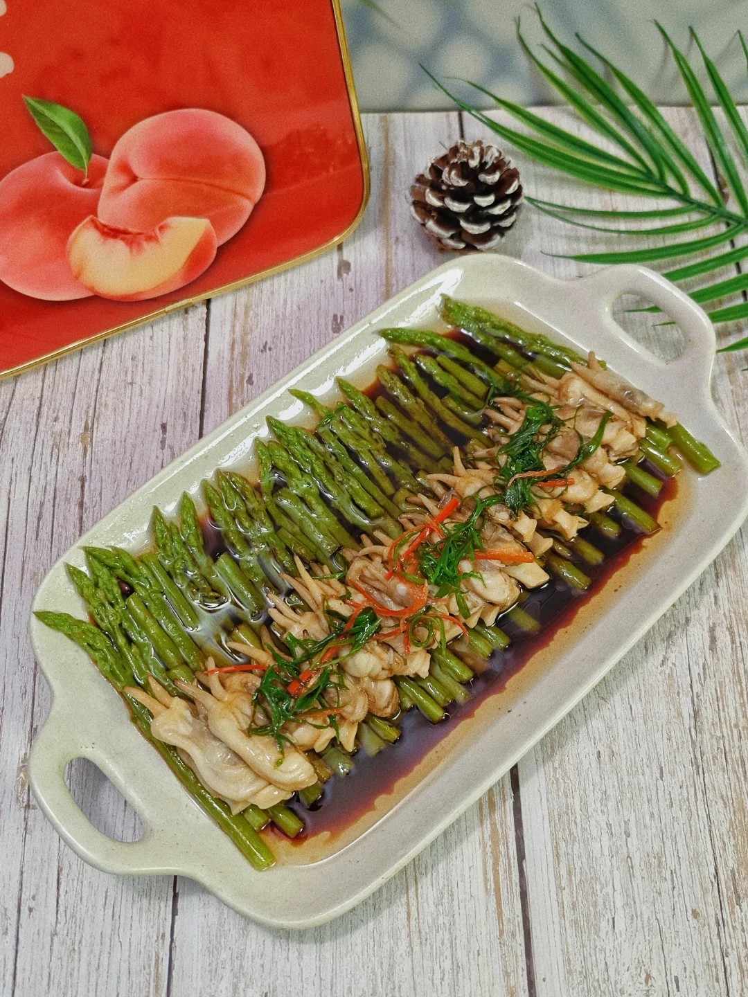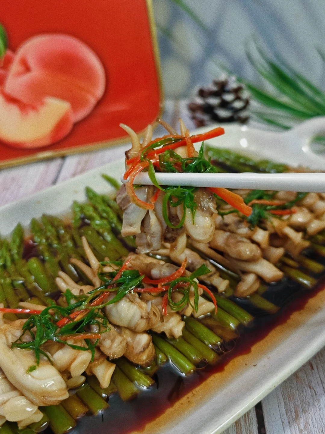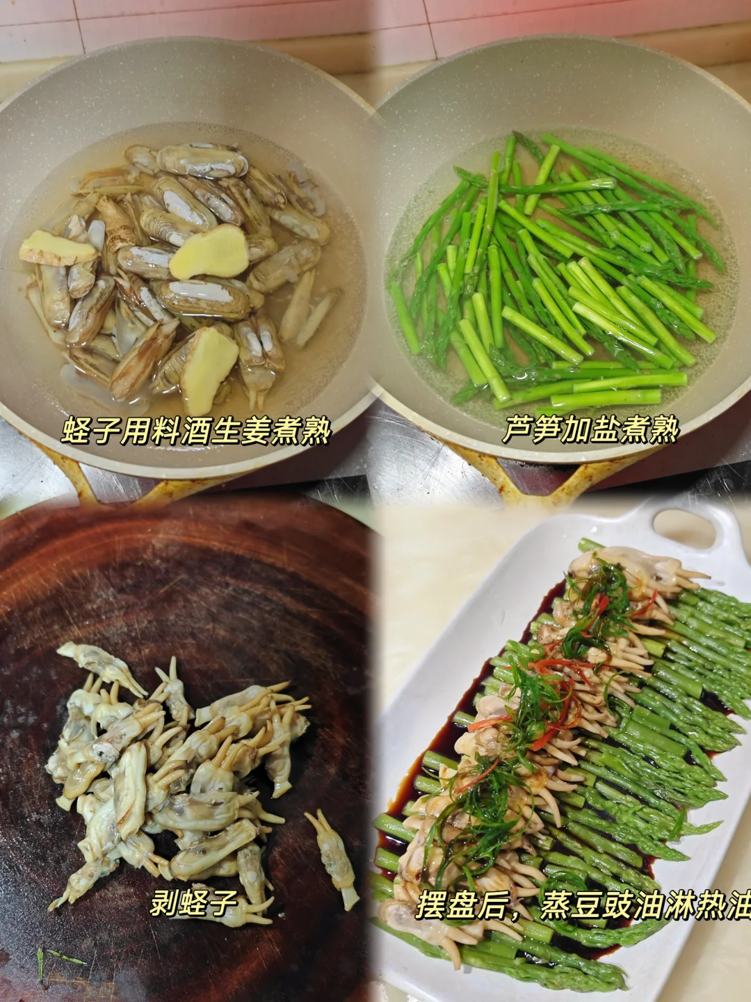 🎋快要过年了,年夜饭做什么菜是不是该准备起来了呢?这道蛏心芦意好看又好吃,倒是蛮适合做年夜饭的一道菜的! · ✅主要食材 蛏子 芦笋 葱 · ✅制作步骤 1⃣️蛏子用盐水泡吐干净沙子后,锅里加料酒生姜煮熟。 2⃣️竹笋去皮,按照盘子的尺寸切半,摆盘好看就好啦。锅里加盐🧂煮5分钟。加盐让芦笋颜色看上去更好看。 3⃣️煮芦笋的时候我们可以剥蛏子,去黑色边边。 4⃣️摆盘,切一些葱丝辣椒丝装饰,加一点蒸豆豉油淋热油就好啦。 · 🎋吃起来又嫩又脆口的一道菜,摆上年夜饭真是太适合了! ·