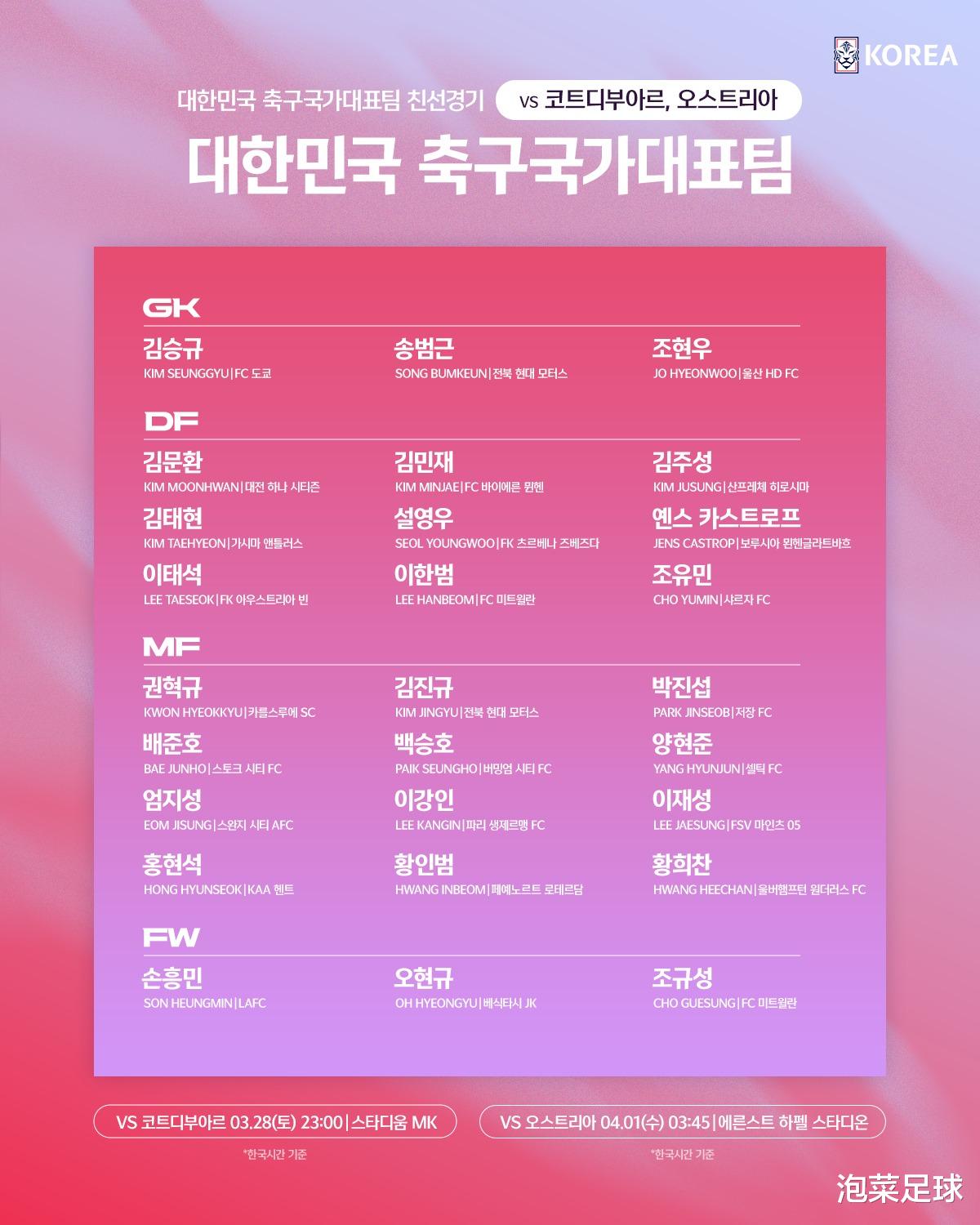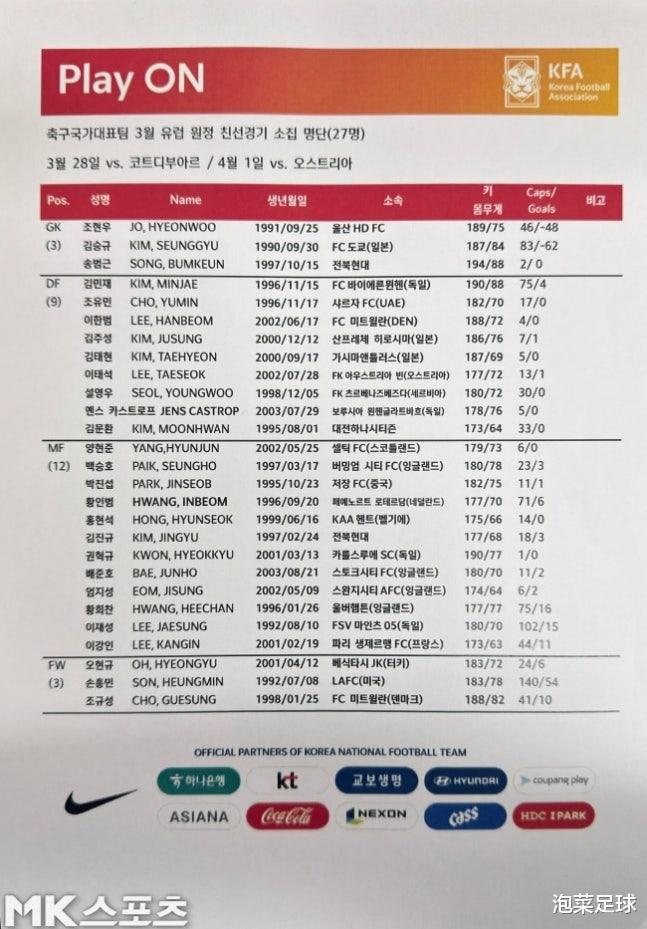 附:韩国国家队出征3月热身赛名单(3月16日发表)