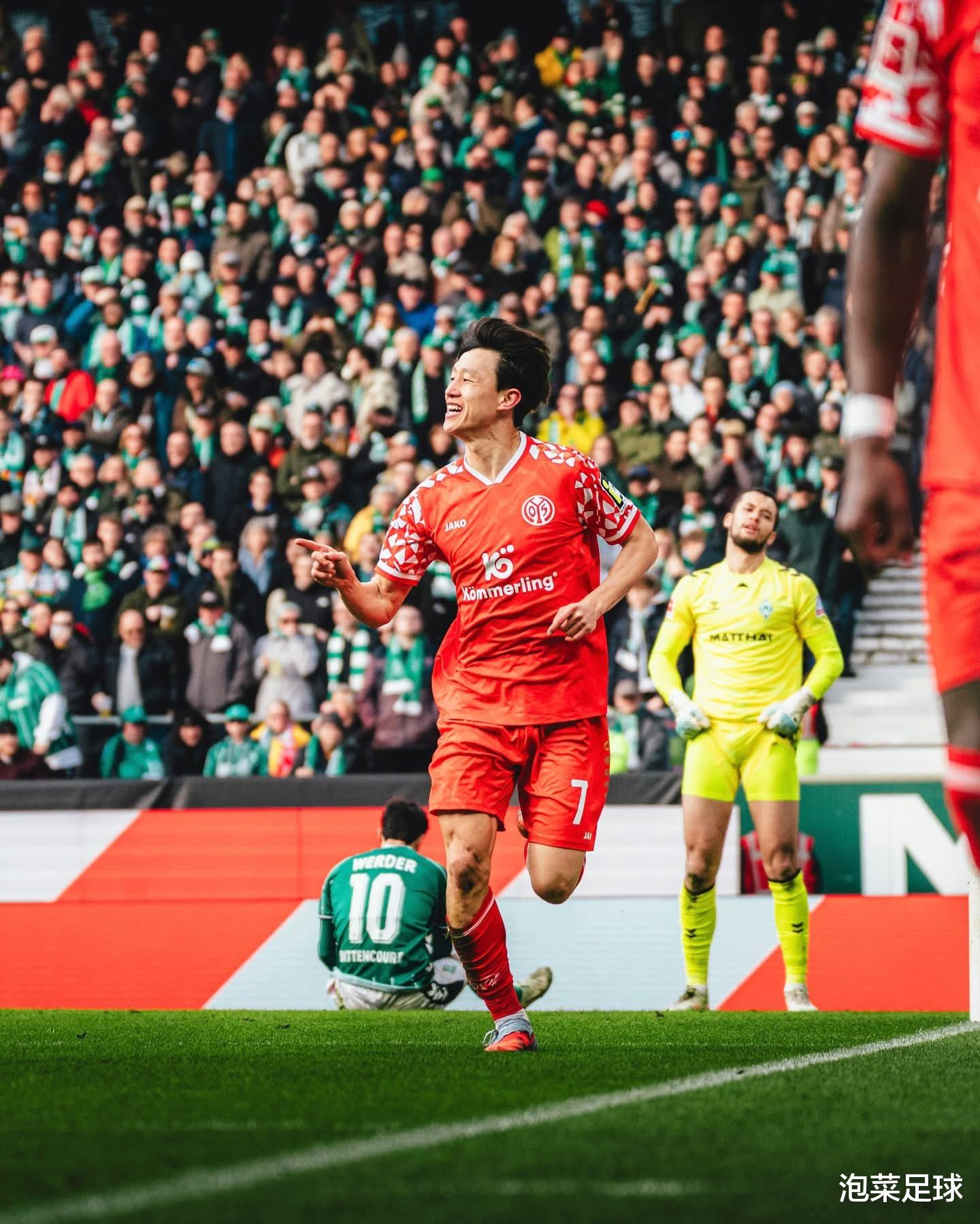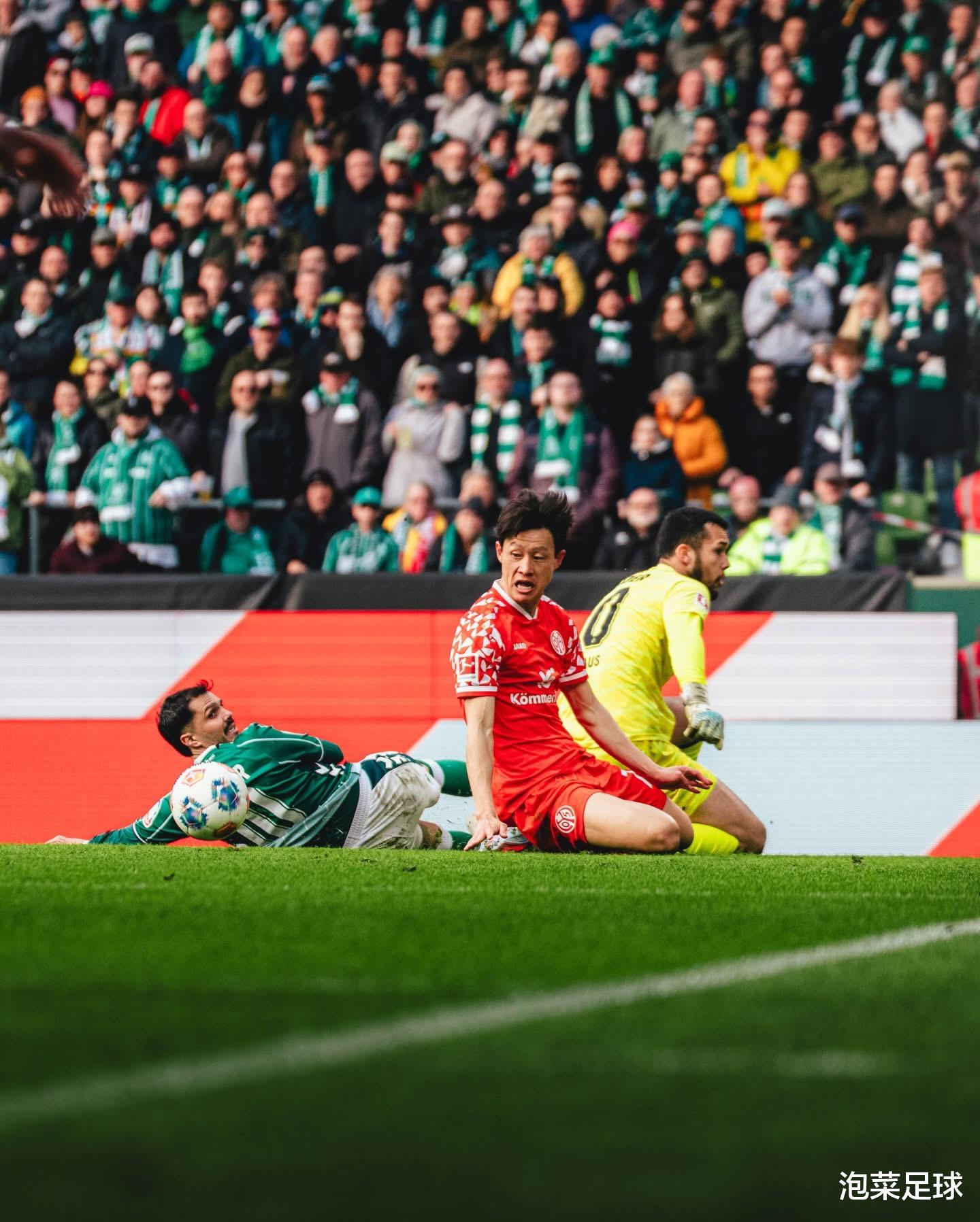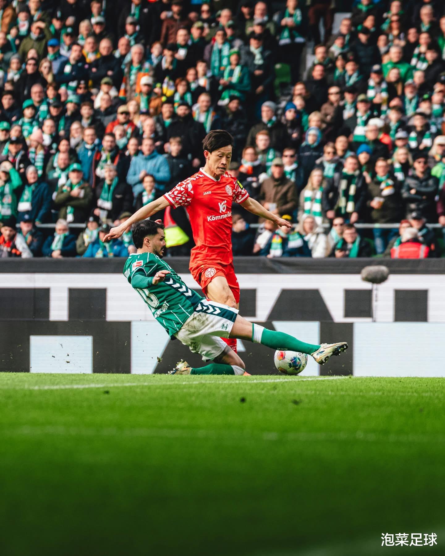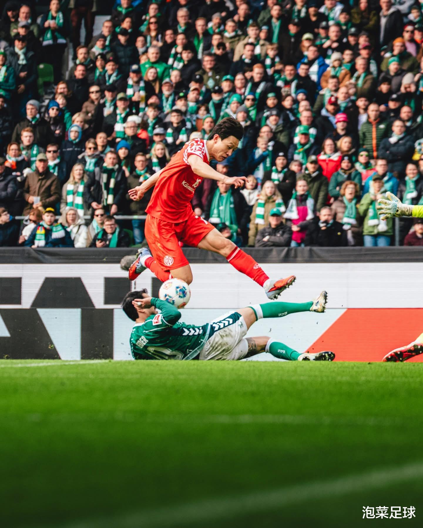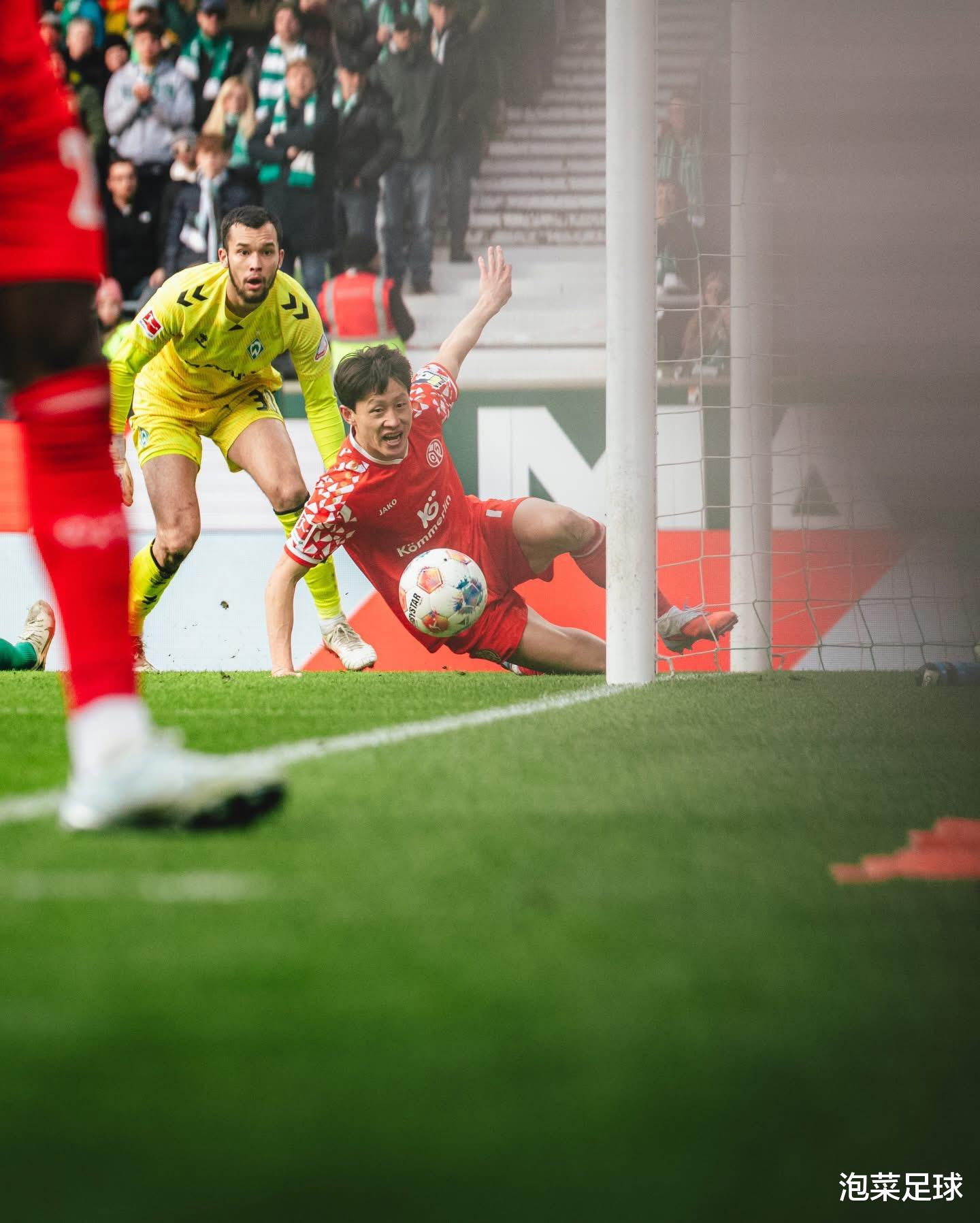 由于上周中美因茨在欧协杯淘汰赛客场比赛中有意雪藏主力,因此从一开场回归首发的主力们就在“拼劲上”干劲十足!开场仅仅五分钟,美因茨就通过一次边路传中头球完成进球,取得了1-0的领先。此后的比赛,李在城和队友们不断阻截来自不莱梅的传球,司职中前卫的李在城身先士卒,他不仅多次向前插上跑位,还多次回到禁区前沿参与围抢防守。下半场进行到第52分钟,李在城在左路高速前插,队友贝克尔从右侧将球传到左路,李在城机敏地跳起躲避了防守球员的铲抢和门将的封堵,并用左脚轻轻改变了球的飞行方向,将球送入球网。这是李在城本赛季的第四粒德甲联赛进球,也是他各项赛事的第六粒进球,这粒金子般的进球,最终左右了比赛的走势,让不莱梅更加被动。