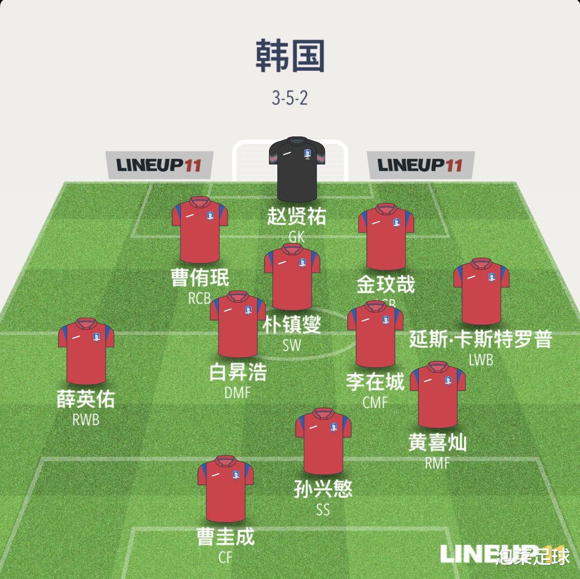 当然,这并非唯一的战术套路。但前锋与中场在现代足球战术板上的根本区别在于:前锋更多活动于中前场等待机会,无需深度参与后场协防;而中场除组织进攻外,必须承担大量防守职责。由此便可理解,为何洪明甫将上一期名单中的“前锋”黄喜灿与裴俊浩列入此次的中场范畴——在洪明甫的战术构想中,二人需要作出必要的战术牺牲。韩国队极有可能祭出一套非对称的33112阵型,锋线具体布局为:黄喜灿、孙兴慜、曹圭成三人并非平行站位,而是黄喜灿偏左且位置稍后,曹圭成顶在最前,孙兴慜居于两人之间,身后则由李刚仁提供支援。这套非对称的352阵型,或将成为洪明甫在欧洲之行重点考察的战术蓝本。