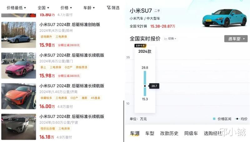 小米SU7新车上市初期,一车难求,在官方APP下定可能要等半年甚至一年的时间,因此有不少消费者加价求购,只希望能够早日开上新车。甚至在二手车市场,小米SU7的二手车价格也和新车没差别。不过随着小米汽车产能的提升,以及市场保有量的增多,尽管小米汽车的热度依然不低,但是终端价格逐渐回归理性,一些里程数超过2万公里的二手车,也展现出了一定的性价比。