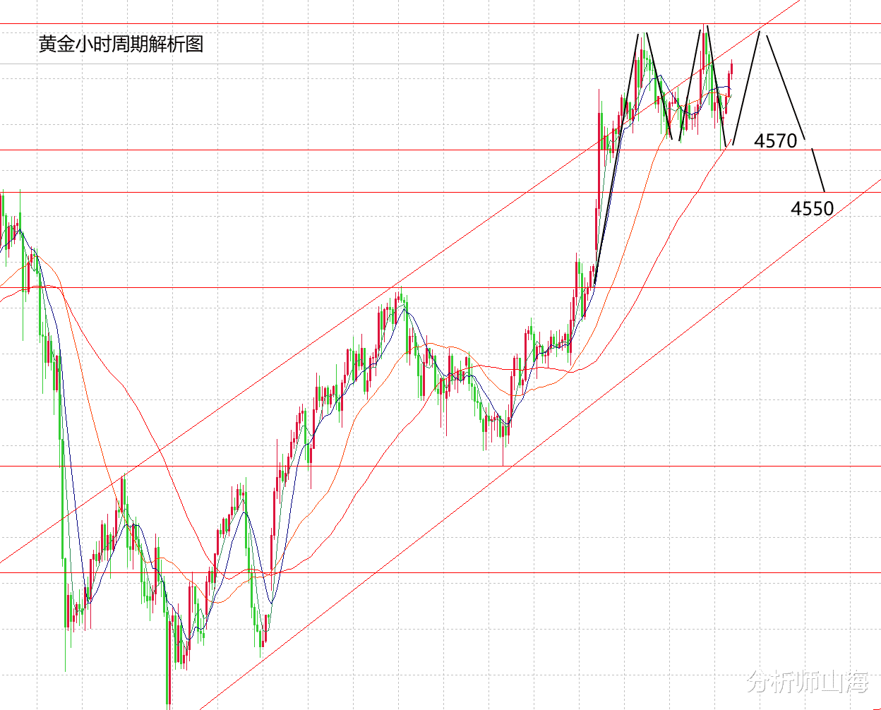 老规矩,先看图,图形比较明显,经过两天的上涨,目前黄金在4570已经形成一个多头趋势的阶段性底部,而上涨则在4630高点受压,当然,当前是多头趋势,山海多次强调4630并不是目前的顶点,趋势之下不猜高,继续走高的话,上方可以看到4680,4800。不过昨天山海讲过,近期黄金不要过分的,惯性的认为开盘就是上涨,需要谨慎对待现在的走势,可能随时会走出调整空间,CPI数据利多,黄金再次走高至4630,但午夜又回落到4570,所以来回波段算是一个扫盘行情,既然是扫盘就要关注高低点的得失,向下关注4570是否破位,跌破后,空头反扑会有一波下跌至4520,并且这种可能性很大,预计在周三,周四会走出来。这波走势很可能会跟前期4550下跌到4270一样,走出150/200美金的下跌空间,那么,今天山海还是要强调,黄金在多头趋势中注意调整的可能性。今天下方支撑两个点,一个是4570,一个是4520,即使是明显多头趋势,不到支撑点不追多,上方4630双顶不破,可以尝试做空,当然破位就不能逆势,上方还有4680。