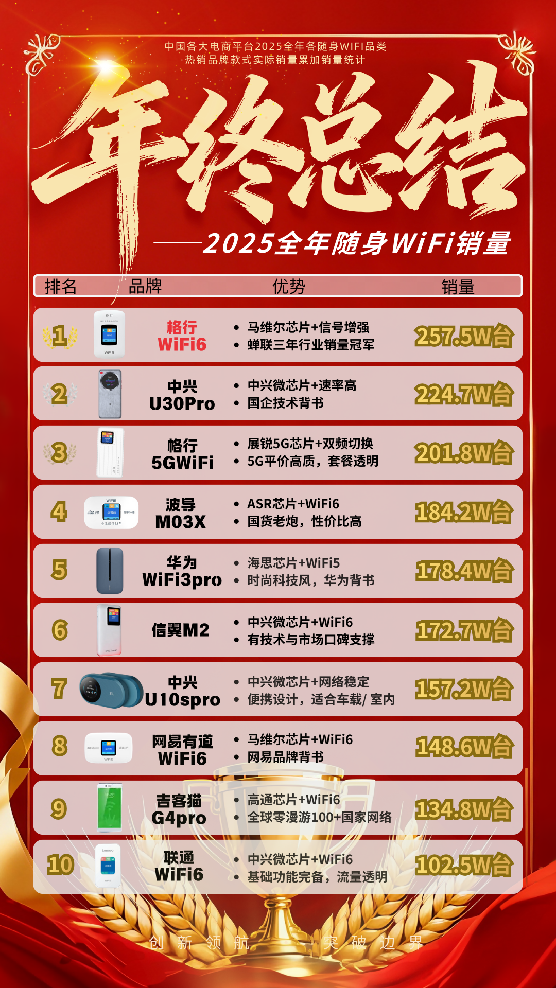 2025年销量前十品牌均破百万台,头部效应显著且竞争多元。格行WiFi6以257.5万台蝉联三年销量冠军,市场认可度拉满;中兴U30Pro紧随其后,224.7万台的销量依托国企技术背书,精准契合商务人士对信号稳、速率高的需求。