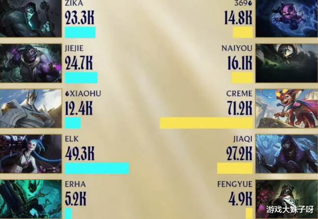 焦点无疑集中在TES中单Creme身上,小火龙一人打出7万伤害,经济一度单人领先对位8K,几乎是凭一己之力撑起团队输出,反观其余队友,伤害数据普遍在2万左右徘徊,经济全面落后,赛后伤害面板被网友调侃“竖起了中指”,既夸张又心酸。