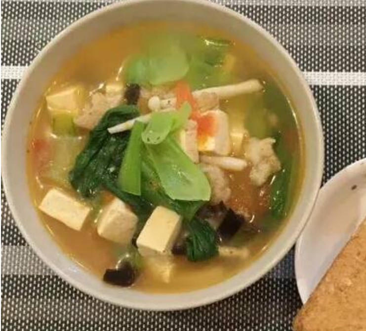 原材料:豆腐100克,油菜100克,鲜香菇、番茄各50克,玉米笋50克,新鲜蔬果(用来制作素高汤)。
