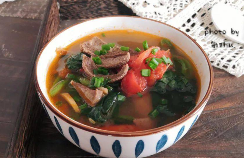 1.菠菜洗净,入沸水锅焯透,投入凉水中,沥干,切段;番茄洗净切片;猪肝洗净切片,用开水烫一下,捞出沥水。