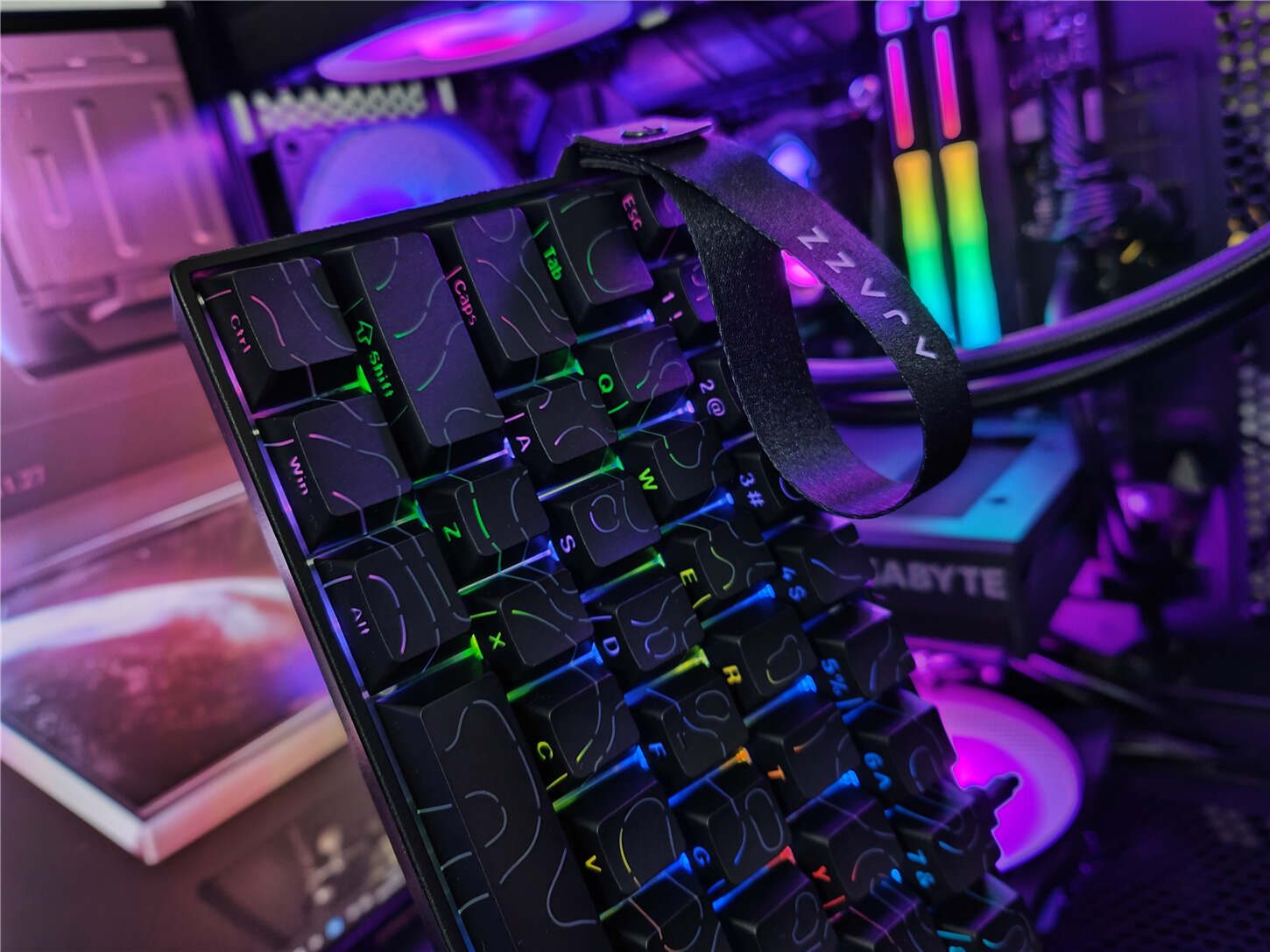 键帽采用了PBT材质,不仅耐磨,而且手感冰凉顺滑。特别是我手中这款“等高线黑”配色,低调却富有个性,既不张扬又充满现代感。值得一提的是,键盘还配备了一条可拆卸的飘带,可以根据个人喜好更换,增添一丝独特的个性化元素。